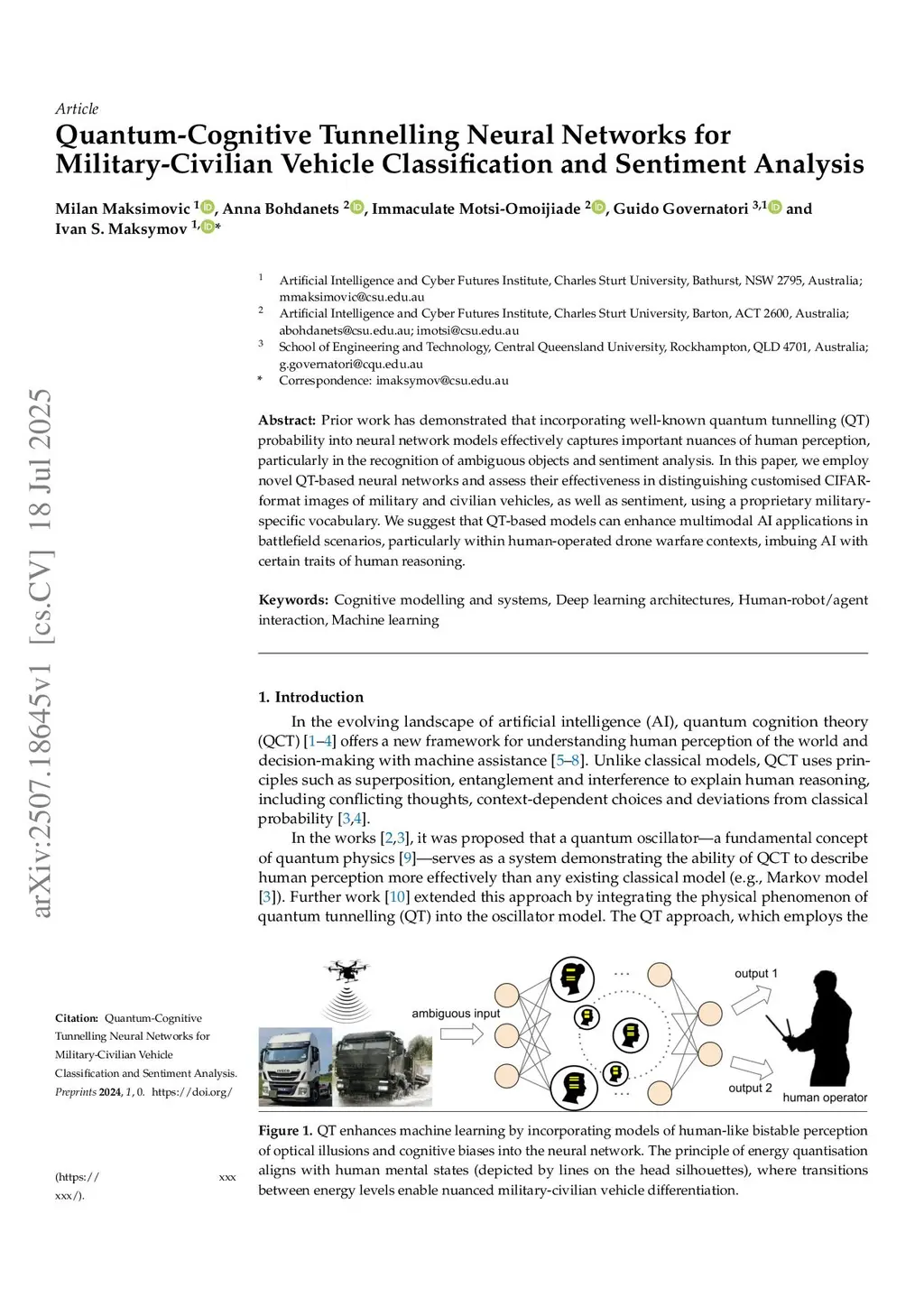 Prior work has demonstrated that incorporating well-known quantum tunnelling (QT) probability into neural network models effectively captures important nuances of human perception, particularly in the recognition of ambiguous objects and sentiment analysis. In this paper, we employ novel QT-based neural networks and assess their effectiveness in distinguishing customised CIFAR-format images of military and civilian vehicles, as well as sentiment, using a proprietary military-specific vocabulary. We suggest that QT-based models can enhance multimodal AI applications in battlefield scenarios, particularly within human-operated drone warfare contexts, imbuing AI with certain traits of human reasoning.