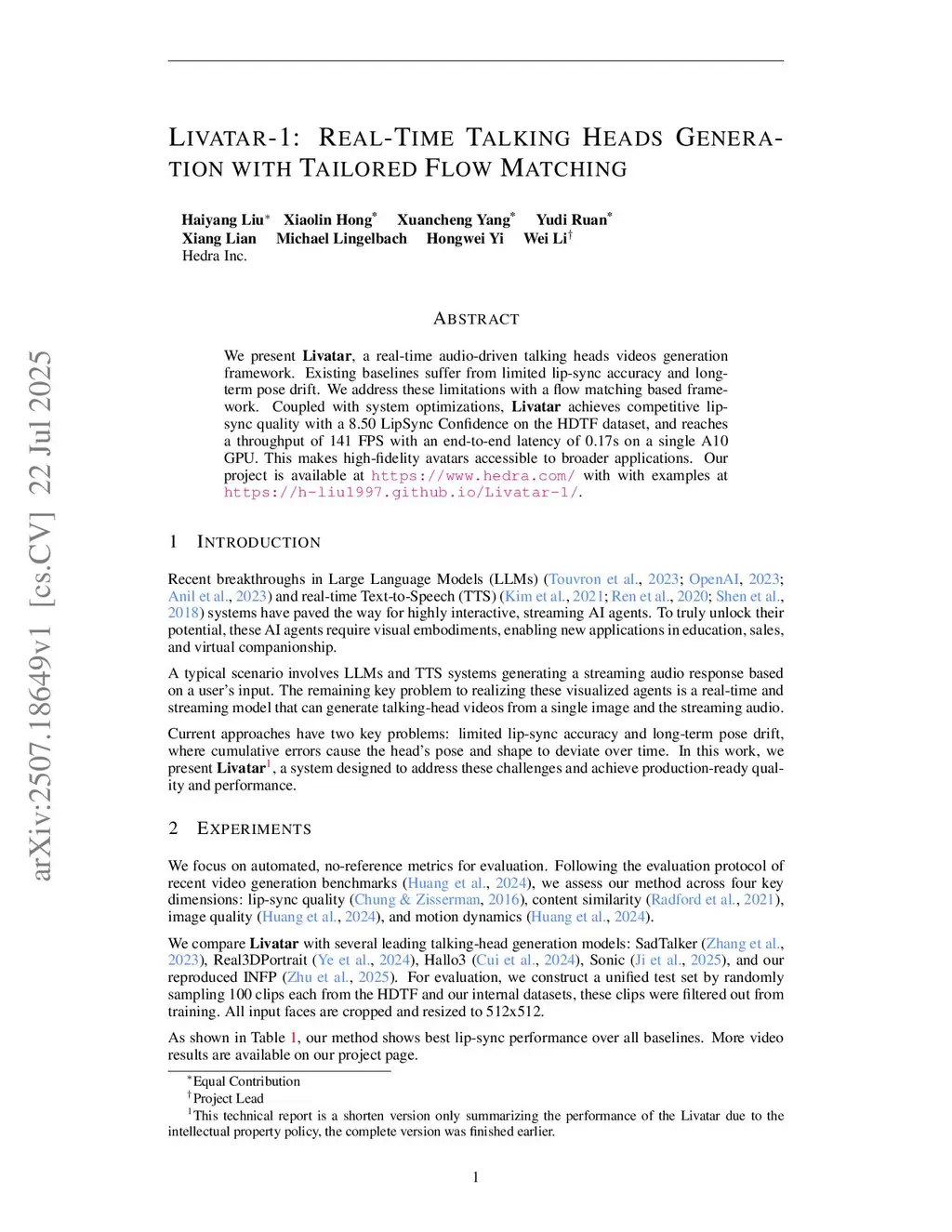 Livatar-1: Real-Time Talking Heads Generation with Tailored Flow Matching
