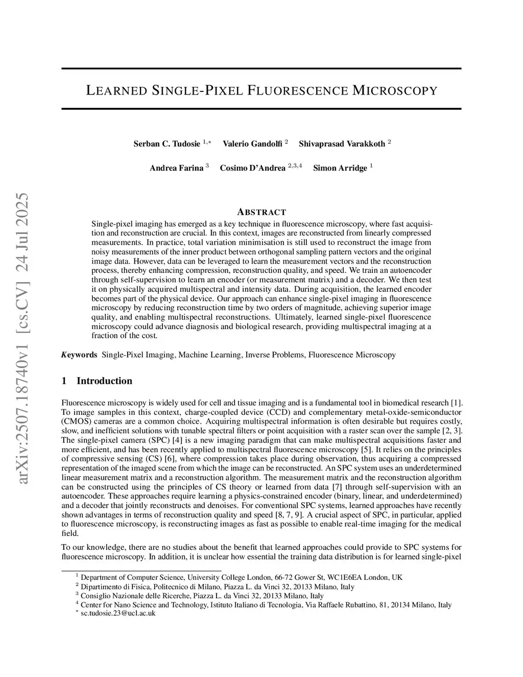 Single-pixel imaging has emerged as a key technique in fluorescence microscopy, where fast acquisition and reconstruction are crucial. In this context, images are reconstructed from linearly compressed measurements. In practice, total variation minimisation is still used to reconstruct the image from noisy measurements of the inner product between orthogonal sampling pattern vectors and the original image data. However, data can be leveraged to learn the measurement vectors and the reconstruction process, thereby enhancing compression, reconstruction quality, and speed. We train an autoencoder through self-supervision to learn an encoder (or measurement matrix) and a decoder. We then test it on physically acquired multispectral and intensity data. During acquisition, the learned encoder becomes part of the physical device. Our approach can enhance single-pixel imaging in fluorescence microscopy by reducing reconstruction time by two orders of magnitude, achieving superior image quality, and enabling multispectral reconstructions. Ultimately, learned single-pixel fluorescence microscopy could advance diagnosis and biological research, providing multispectral imaging at a fraction of the cost.