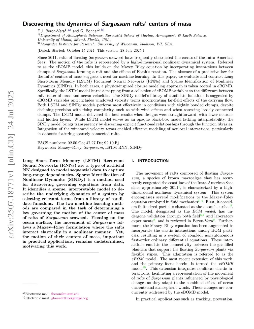 Since 2011, rafts of floating \emph{Sargassum} seaweed have frequently obstructed the coasts of the Intra-Americas Seas. The motion of the rafts is represented by a high-dimensional nonlinear dynamical system. Referred to as the eBOMB model, this builds on the Maxey--Riley equation by incorporating interactions between clumps of \emph{Sargassum} forming a raft and the effects of Earth's rotation. The absence of a predictive law for the rafts' centers of mass suggests a need for machine learning. In this paper, we evaluate and contrast Long Short-Term Memory (LSTM) Recurrent Neural Networks (RNNs) and Sparse Identification of Nonlinear Dynamics (SINDy). In both cases, a physics-inspired closure modeling approach is taken rooted in eBOMB. Specifically, the LSTM model learns a mapping from a collection of eBOMB variables to the difference between raft center-of-mass and ocean velocities. The SINDy model's library of candidate functions is suggested by eBOMB variables and includes windowed velocity terms incorporating far-field effects of the carrying flow. Both LSTM and SINDy models perform most effectively in conditions with tightly bonded clumps, despite declining precision with rising complexity, such as with wind effects and when assessing loosely connected clumps. The LSTM model delivered the best results when designs were straightforward, with fewer neurons and hidden layers. While LSTM model serves as an opaque black-box model lacking interpretability, the SINDy model brings transparency by discerning explicit functional relationships through the function libraries. Integration of the windowed velocity terms enabled effective modeling of nonlocal interactions, particularly in datasets featuring sparsely connected rafts.