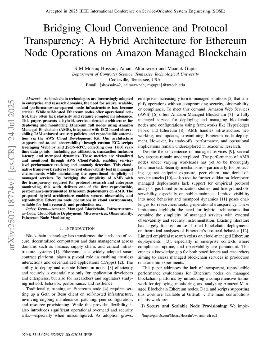 As blockchain technologies are increasingly adopted in enterprise and research domains, the need for secure, scalable, and performance-transparent node infrastructure has become critical. While self-hosted Ethereum nodes offer operational control, they often lack elasticity and require complex maintenance. This paper presents a hybrid, service-oriented architecture for deploying and monitoring Ethereum full nodes using Amazon Managed Blockchain (AMB), integrated with EC2-based observability, IAM-enforced security policies, and reproducible automation via the AWS Cloud Development Kit. Our architecture supports end-to-end observability through custom EC2 scripts leveragingthis http URLand JSON-RPC, collecting over 1,000 real-time data points-including gas utilization, transaction inclusion latency, and mempool dynamics. These metrics are visualized and monitored through AWS CloudWatch, enabling service-level performance tracking and anomaly detection. This cloud-native framework restores low-level observability lost in managed environments while maintaining the operational simplicity of managed services. By bridging the simplicity of AMB with the transparency required for protocol research and enterprise monitoring, this work delivers one of the first reproducible, performance-instrumented Ethereum deployments on AMB. The proposed hybrid architecture enables secure, observable, and reproducible Ethereum node operations in cloud environments, suitable for both research and production use.