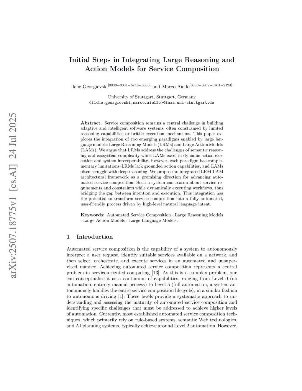 Service composition remains a central challenge in building adaptive and intelligent software systems, often constrained by limited reasoning capabilities or brittle execution mechanisms. This paper explores the integration of two emerging paradigms enabled by large language models: Large Reasoning Models (LRMs) and Large Action Models (LAMs). We argue that LRMs address the challenges of semantic reasoning and ecosystem complexity while LAMs excel in dynamic action execution and system interoperability. However, each paradigm has complementary limitations - LRMs lack grounded action capabilities, and LAMs often struggle with deep reasoning. We propose an integrated LRM-LAM architectural framework as a promising direction for advancing automated service composition. Such a system can reason about service requirements and constraints while dynamically executing workflows, thus bridging the gap between intention and execution. This integration has the potential to transform service composition into a fully automated, user-friendly process driven by high-level natural language intent.