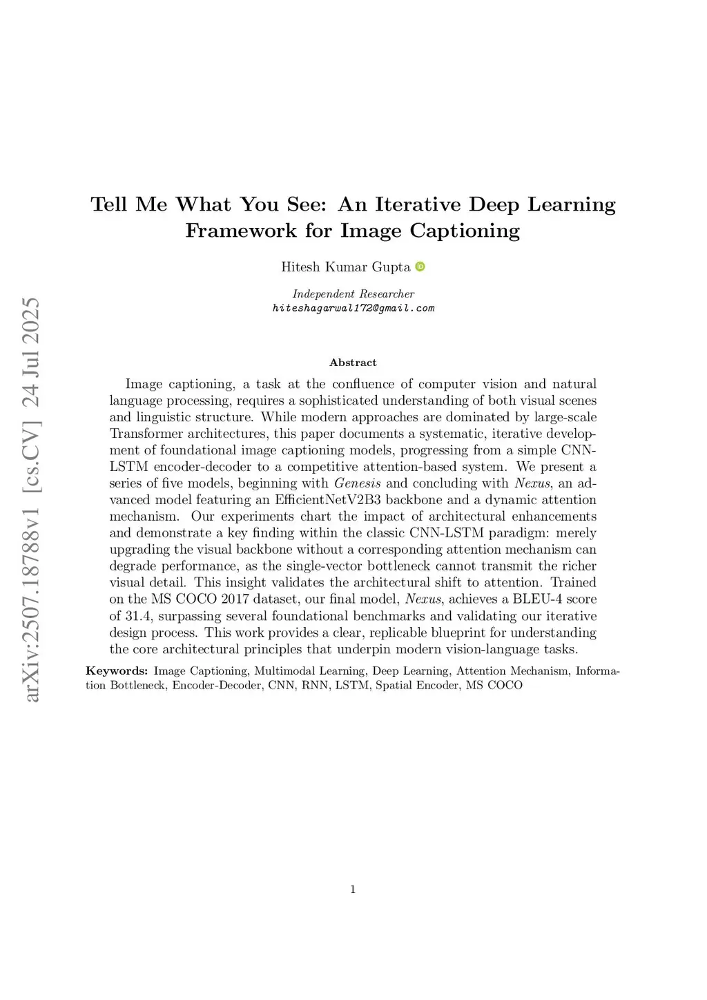 Image captioning, situated at the intersection of computer vision and natural language processing, requires a sophisticated understanding of both visual scenes and linguistic structure. While modern approaches are dominated by large-scale Transformer architectures, this paper documents a systematic, iterative development of foundational image captioning models, progressing from a simple CNN-LSTM encoder-decoder to a competitive attention-based system. This paper presents a series of five models, beginning with Genesis and concluding with Nexus, an advanced model featuring an EfficientNetV2B3 backbone and a dynamic attention mechanism. The experiments chart the impact of architectural enhancements and demonstrate a key finding within the classic CNN-LSTM paradigm: merely upgrading the visual backbone without a corresponding attention mechanism can degrade performance, as the single-vector bottleneck cannot transmit the richer visual detail. This insight validates the architectural shift to attention. Trained on the MS COCO 2017 dataset, the final model, Nexus, achieves a BLEU-4 score of 31.4, surpassing several foundational benchmarks and validating the iterative design process. This work provides a clear, replicable blueprint for understanding the core architectural principles that underpin modern vision-language tasks.