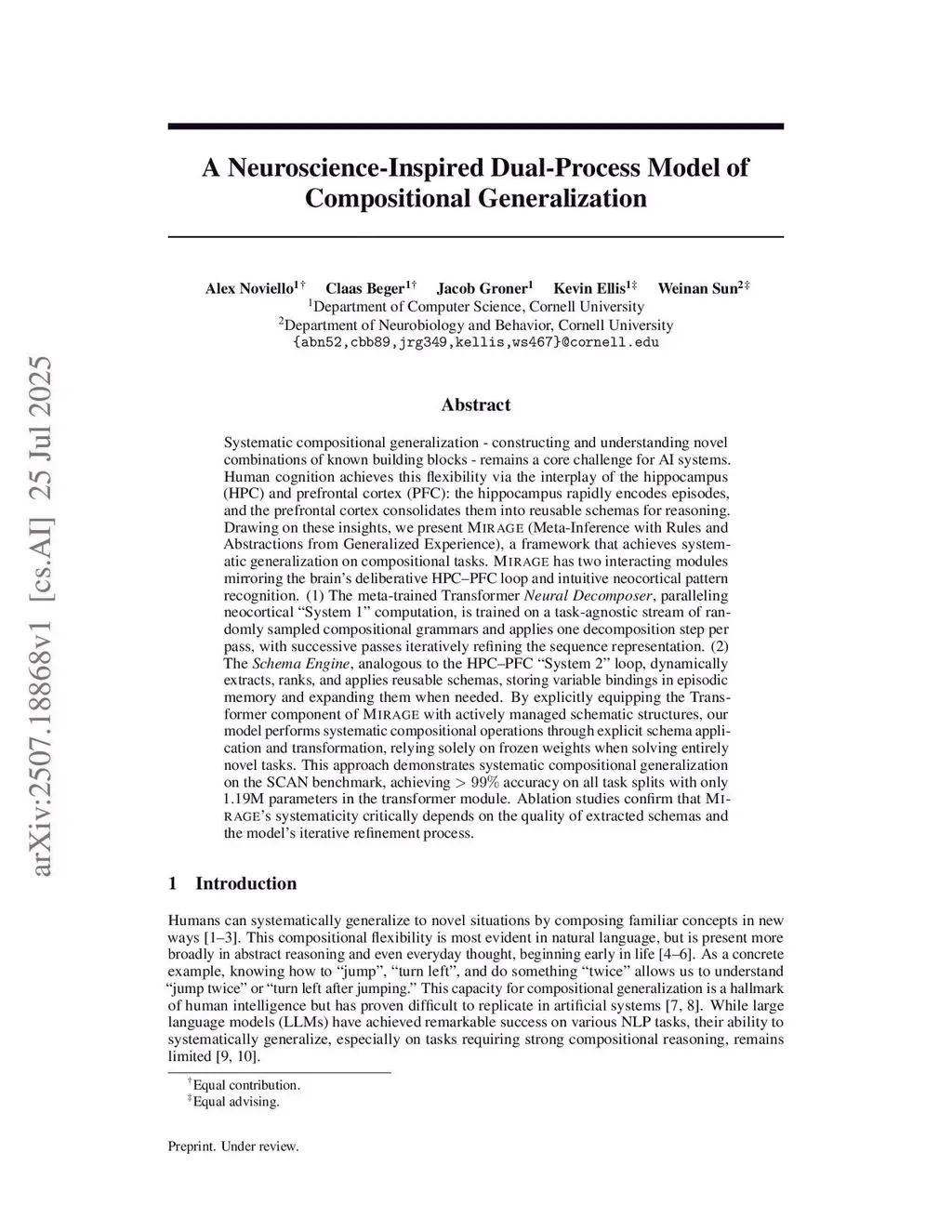 Deep learning models struggle with systematic compositional generalization, a hallmark of human cognition. We propose \textsc{Mirage}, a neuro-inspired dual-process model that offers a processing account for this ability. It combines a fast, intuitive ``System~1'' (a meta-trained Transformer) with a deliberate, rule-based ``System~2'' (a Schema Engine), mirroring the brain's neocortical and hippocampal--prefrontal circuits. Trained to perform general, single-step decomposition on a stream of random grammars, Mirage achieves 99\% accuracy on all splits of the SCAN benchmark in a task-agnostic setting. Ablations confirm that the model's systematic behavior emerges from the architectural interplay of its two systems, particularly its use of explicit, prioritized schemas and iterative refinement. In line with recent progress on recursive/recurrent Transformer approaches, Mirage preserves an iterative neural update while externalizing declarative control into an interpretable schema module. Our work provides a concrete computational model for interpreting how compositional reasoning can arise from a modular cognitive architecture.