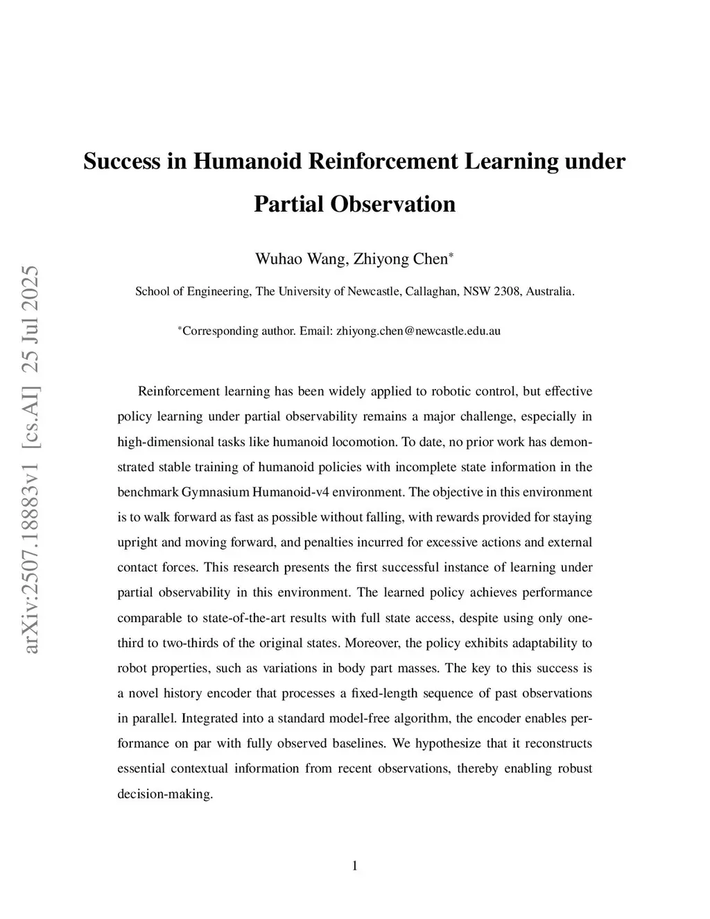 Reinforcement learning has been widely applied to robotic control, but effective policy learning under partial observability remains a major challenge, especially in high-dimensional tasks like humanoid locomotion. To date, no prior work has demonstrated stable training of humanoid policies with incomplete state information in the benchmark Gymnasium Humanoid-v4 environment. The objective in this environment is to walk forward as fast as possible without falling, with rewards provided for staying upright and moving forward, and penalties incurred for excessive actions and external contact forces. This research presents the first successful instance of learning under partial observability in this environment. The learned policy achieves performance comparable to state-of-the-art results with full state access, despite using only one-third to two-thirds of the original states. Moreover, the policy exhibits adaptability to robot properties, such as variations in body part masses. The key to this success is a novel history encoder that processes a fixed-length sequence of past observations in parallel. Integrated into a standard model-free algorithm, the encoder enables performance on par with fully observed baselines. We hypothesize that it reconstructs essential contextual information from recent observations, thereby enabling robust decision-making.