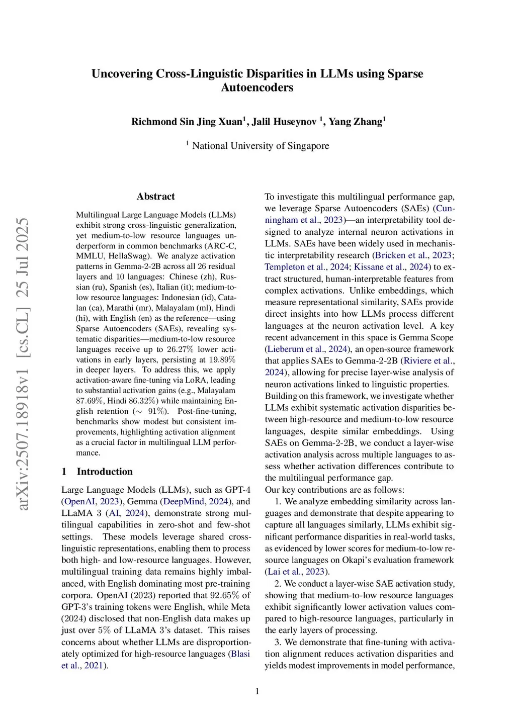 Multilingual large language models (LLMs) exhibit strong cross-linguistic generalization, yet medium to low resource languages underperform on common benchmarks such as ARC-Challenge, MMLU, and HellaSwag. We analyze activation patterns in Gemma-2-2B across all 26 residual layers and 10 languages: Chinese (zh), Russian (ru), Spanish (es), Italian (it), medium to low resource languages including Indonesian (id), Catalan (ca), Marathi (mr), Malayalam (ml), and Hindi (hi), with English (en) as the reference. Using Sparse Autoencoders (SAEs), we reveal systematic disparities in activation patterns. Medium to low resource languages receive up to 26.27 percent lower activations in early layers, with a persistent gap of 19.89 percent in deeper layers. To address this, we apply activation-aware fine-tuning via Low-Rank Adaptation (LoRA), leading to substantial activation gains, such as 87.69 percent for Malayalam and 86.32 percent for Hindi, while maintaining English retention at approximately 91 percent. After fine-tuning, benchmark results show modest but consistent improvements, highlighting activation alignment as a key factor in enhancing multilingual LLM performance.