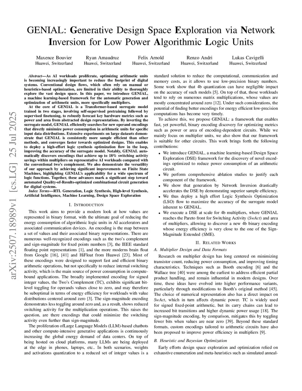 As AI workloads proliferate, optimizing arithmetic units is becoming increasingly important for reducing the footprint of digital systems. Conventional design flows, which often rely on manual or heuristic-based optimization, are limited in their ability to thoroughly explore the vast design space. In this paper, we introduce GENIAL, a machine learning-based framework for the automatic generation and optimization of arithmetic units, with a focus on multipliers.At the core of GENIAL is a Transformer-based surrogate model trained in two stages, involving self-supervised pretraining followed by supervised finetuning, to robustly forecast key hardware metrics such as power and area from abstracted design representations. By inverting the surrogate model, GENIAL efficiently searches for new operand encodings that directly minimize power consumption in arithmetic units for specific input data distributions. Extensive experiments on large datasets demonstrate that GENIAL is consistently more sample efficient than other methods, and converges faster towards optimized designs. This enables deployment of a high-effort logic synthesis optimization flow in the loop, improving the accuracy of the surrogate model. Notably, GENIAL automatically discovers encodings that achieve up to 18% switching activity savings within multipliers on representative AI workloads compared with the conventional two's complement. We also demonstrate the versatility of our approach by achieving significant improvements on Finite State Machines, highlighting GENIAL's applicability for a wide spectrum of logic functions. Together, these advances mark a significant step toward automated Quality-of-Results-optimized combinational circuit generation for digital systems.