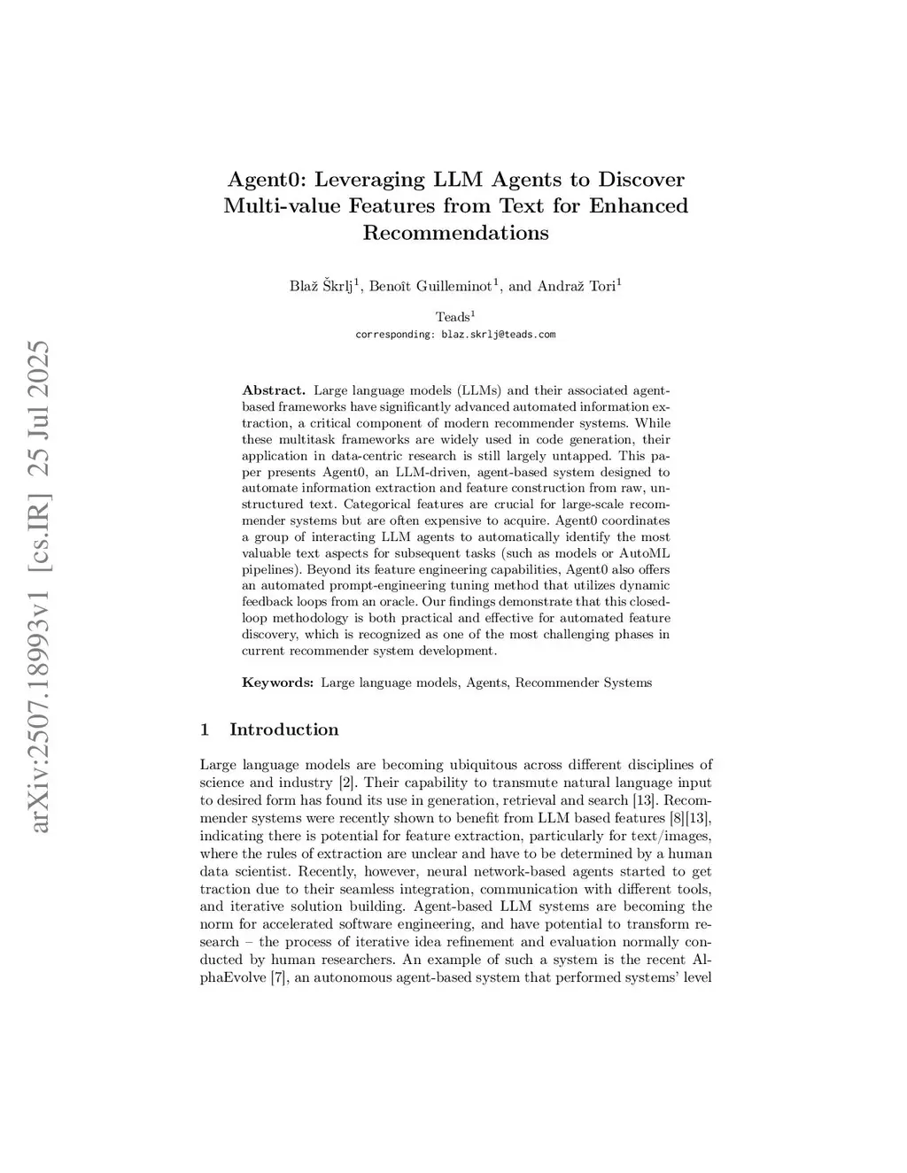 Large language models (LLMs) and their associated agent-based frameworks have significantly advanced automated information extraction, a critical component of modern recommender systems. While these multitask frameworks are widely used in code generation, their application in data-centric research is still largely untapped. This paper presents Agent0, an LLM-driven, agent-based system designed to automate information extraction and feature construction from raw, unstructured text. Categorical features are crucial for large-scale recommender systems but are often expensive to acquire. Agent0 coordinates a group of interacting LLM agents to automatically identify the most valuable text aspects for subsequent tasks (such as models or AutoML pipelines). Beyond its feature engineering capabilities, Agent0 also offers an automated prompt-engineering tuning method that utilizes dynamic feedback loops from an oracle. Our findings demonstrate that this closed-loop methodology is both practical and effective for automated feature discovery, which is recognized as one of the most challenging phases in current recommender system development.