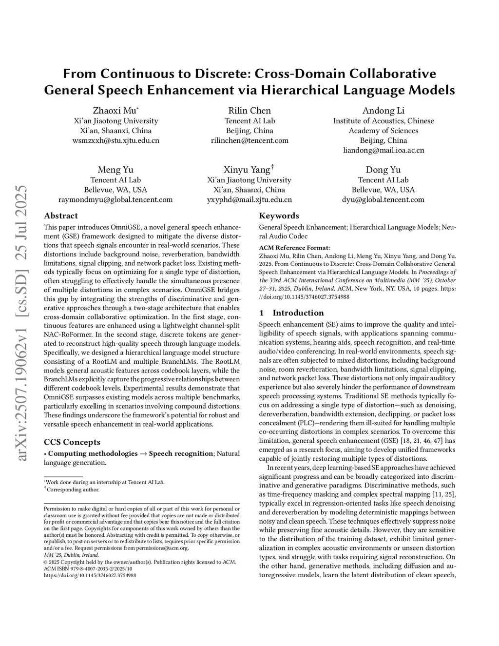 This paper introduces OmniGSE, a novel general speech enhancement (GSE) framework designed to mitigate the diverse distortions that speech signals encounter in real-world scenarios. These distortions include background noise, reverberation, bandwidth limitations, signal clipping, and network packet loss. Existing methods typically focus on optimizing for a single type of distortion, often struggling to effectively handle the simultaneous presence of multiple distortions in complex scenarios. OmniGSE bridges this gap by integrating the strengths of discriminative and generative approaches through a two-stage architecture that enables cross-domain collaborative optimization. In the first stage, continuous features are enhanced using a lightweight channel-split NAC-RoFormer. In the second stage, discrete tokens are generated to reconstruct high-quality speech through language models. Specifically, we designed a hierarchical language model structure consisting of a RootLM and multiple BranchLMs. The RootLM models general acoustic features across codebook layers, while the BranchLMs explicitly capture the progressive relationships between different codebook levels. Experimental results demonstrate that OmniGSE surpasses existing models across multiple benchmarks, particularly excelling in scenarios involving compound distortions. These findings underscore the framework's potential for robust and versatile speech enhancement in real-world applications.