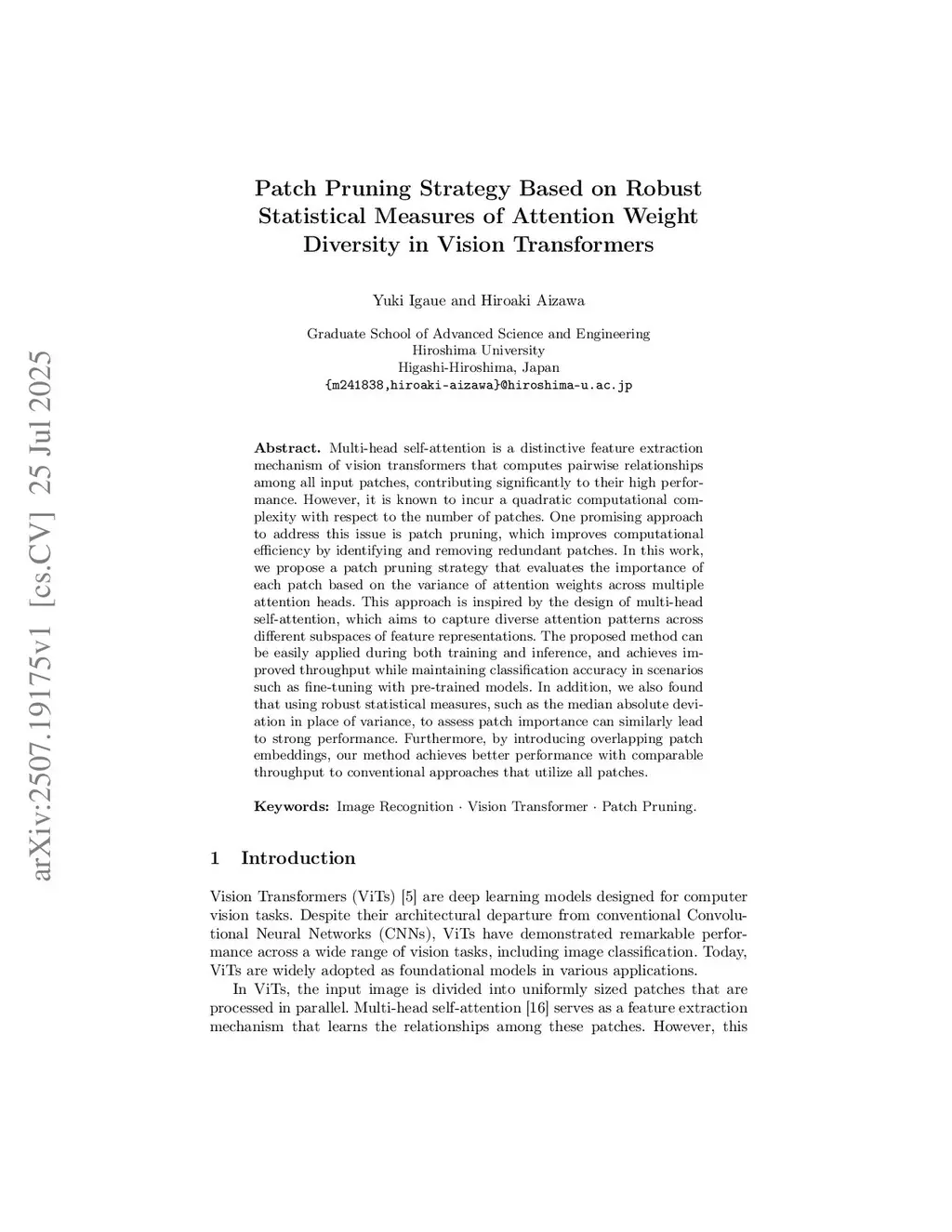 Multi-head self-attention is a distinctive feature extraction mechanism of vision transformers that computes pairwise relationships among all input patches, contributing significantly to their high performance. However, it is known to incur a quadratic computational complexity with respect to the number of patches. One promising approach to address this issue is patch pruning, which improves computational efficiency by identifying and removing redundant patches. In this work, we propose a patch pruning strategy that evaluates the importance of each patch based on the variance of attention weights across multiple attention heads. This approach is inspired by the design of multi-head self-attention, which aims to capture diverse attention patterns across different subspaces of feature representations. The proposed method can be easily applied during both training and inference, and achieves improved throughput while maintaining classification accuracy in scenarios such as fine-tuning with pre-trained models. In addition, we also found that using robust statistical measures, such as the median absolute deviation in place of variance, to assess patch importance can similarly lead to strong performance. Furthermore, by introducing overlapping patch embeddings, our method achieves better performance with comparable throughput to conventional approaches that utilize all patches.