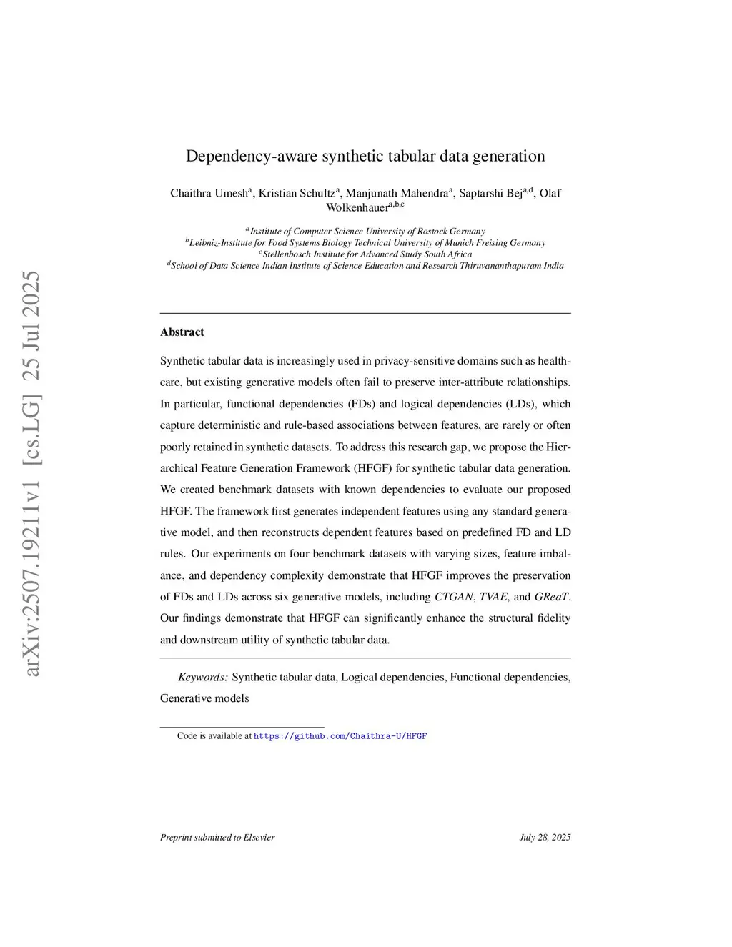 Synthetic tabular data is increasingly used in privacy-sensitive domains such as health care, but existing generative models often fail to preserve inter-attribute relationships. In particular, functional dependencies (FDs) and logical dependencies (LDs), which capture deterministic and rule-based associations between features, are rarely or often poorly retained in synthetic datasets. To address this research gap, we propose the Hierarchical Feature Generation Framework (HFGF) for synthetic tabular data generation. We created benchmark datasets with known dependencies to evaluate our proposed HFGF. The framework first generates independent features using any standard generative model, and then reconstructs dependent features based on predefined FD and LD rules. Our experiments on four benchmark datasets with varying sizes, feature imbalance, and dependency complexity demonstrate that HFGF improves the preservation of FDs and LDs across six generative models, including CTGAN, TVAE, and GReaT. Our findings demonstrate that HFGF can significantly enhance the structural fidelity and downstream utility of synthetic tabular data.