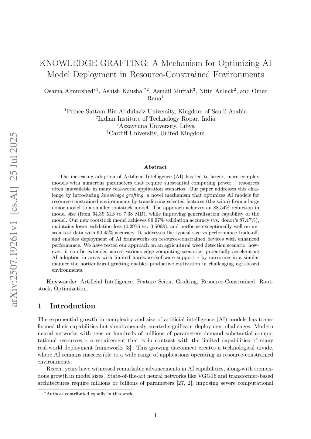 The increasing adoption of Artificial Intelligence (AI) has led to larger, more complex models with numerous parameters that require substantial computing power -- resources often unavailable in many real-world application scenarios. Our paper addresses this challenge by introducing knowledge grafting, a novel mechanism that optimizes AI models for resource-constrained environments by transferring selected features (the scion) from a large donor model to a smaller rootstock model. The approach achieves an 88.54% reduction in model size (from 64.39 MB to 7.38 MB), while improving generalization capability of the model. Our new rootstock model achieves 89.97% validation accuracy (vs. donor's 87.47%), maintains lower validation loss (0.2976 vs. 0.5068), and performs exceptionally well on unseen test data with 90.45% accuracy. It addresses the typical size vs performance trade-off, and enables deployment of AI frameworks on resource-constrained devices with enhanced performance. We have tested our approach on an agricultural weed detection scenario, however, it can be extended across various edge computing scenarios, potentially accelerating AI adoption in areas with limited hardware/software support -- by mirroring in a similar manner the horticultural grafting enables productive cultivation in challenging agri-based environments.