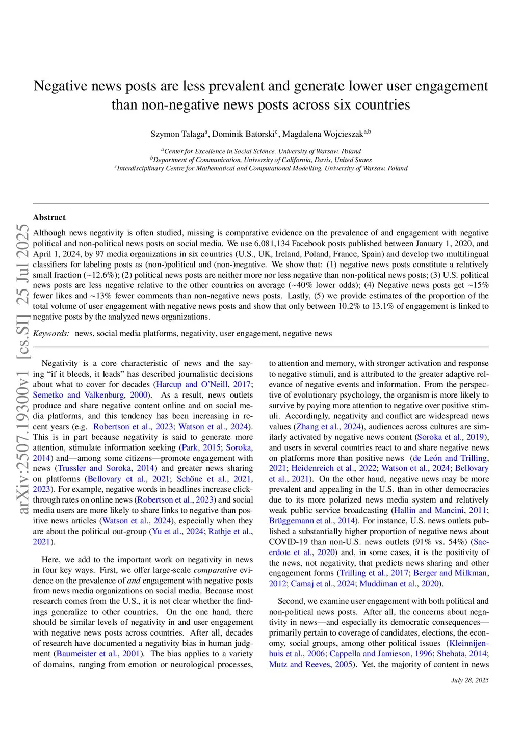 Negative news posts are less prevalent and generate lower user engagement than non-negative news posts across six countries