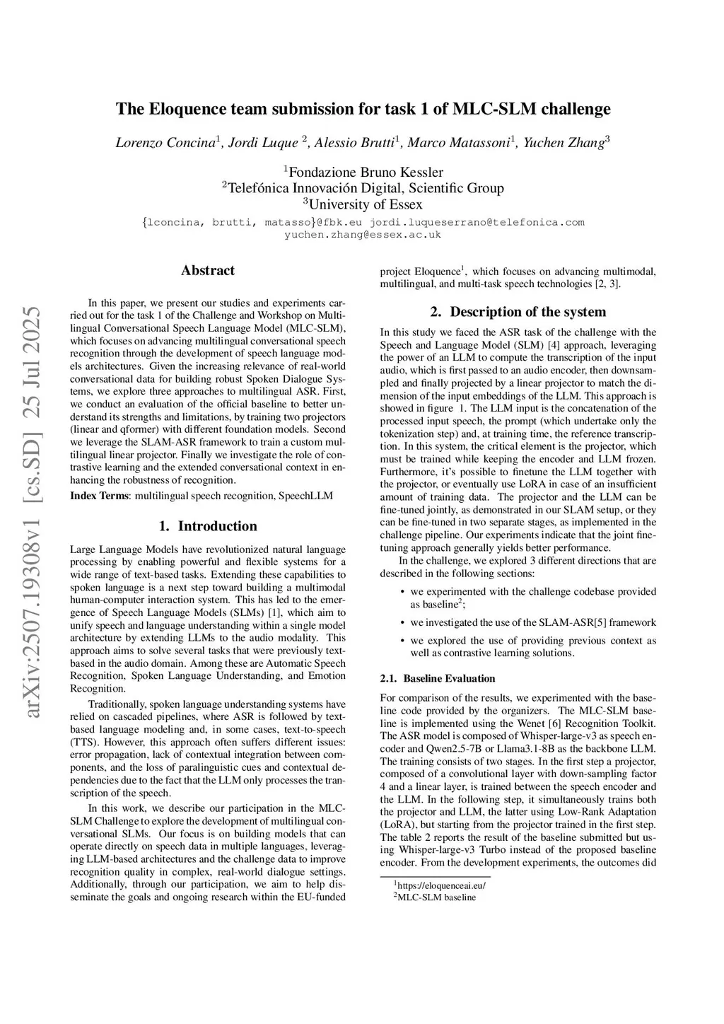 In this paper, we present our studies and experiments carried out for the task 1 of the Challenge and Workshop on Multilingual Conversational Speech Language Model (MLC-SLM), which focuses on advancing multilingual conversational speech recognition through the development of speech language models architectures. Given the increasing relevance of real-world conversational data for building robust Spoken Dialogue Systems, we explore three approaches to multilingual ASR. First, we conduct an evaluation of the official baseline to better understand its strengths and limitations, by training two projectors (linear and qformer) with different foundation models. Second we leverage the SLAM-ASR framework to train a custom multilingual linear projector. Finally we investigate the role of contrastive learning and the extended conversational context in enhancing the robustness of recognition.