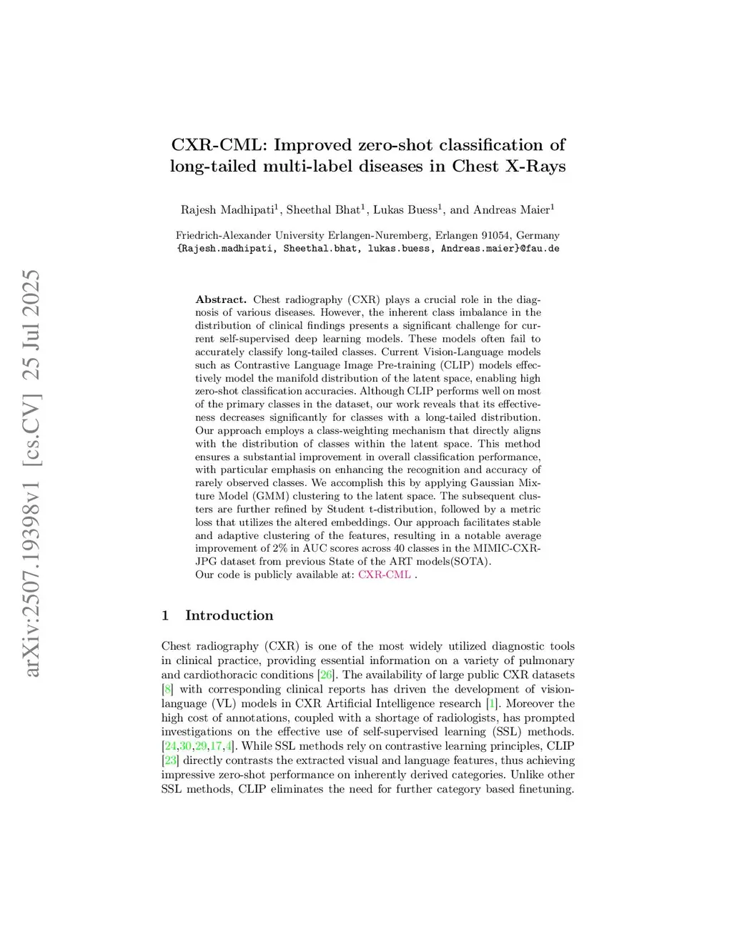 Chest radiography (CXR) plays a crucial role in the diagnosis of various diseases. However, the inherent class imbalance in the distribution of clinical findings presents a significant challenge for current self-supervised deep learning models. These models often fail to accurately classify long-tailed classes. Current Vision-Language models such as Contrastive Language Image Pre-training (CLIP) models effectively model the manifold distribution of the latent space, enabling high zero-shot classification accuracies. Although CLIP performs well on most of the primary classes in the dataset, our work reveals that its effectiveness decreases significantly for classes with a long-tailed distribution. Our approach employs a class-weighting mechanism that directly aligns with the distribution of classes within the latent space. This method ensures a substantial improvement in overall classification performance, with particular emphasis on enhancing the recognition and accuracy of rarely observed classes. We accomplish this by applying Gaussian Mixture Model (GMM) clustering to the latent space. The subsequent clusters are further refined by Student t-distribution, followed by a metric loss that utilizes the altered embeddings. Our approach facilitates stable and adaptive clustering of the features. This results in a notable average improvement of 7\% points in zero-shot AUC scores across 40 classes in the MIMIC-CXR-JPG dataset from previous SOTA models.