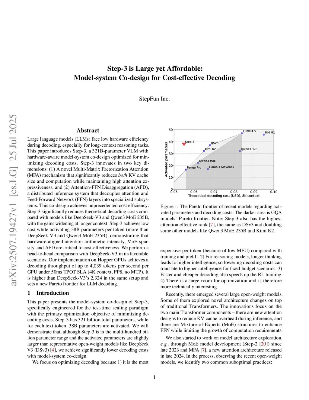 Large language models (LLMs) face low hardware efficiency during decoding, especially for long-context reasoning tasks. This paper introduces Step-3, a 321B-parameter VLM with hardware-aware model-system co-design optimized for minimizing decoding costs. Step-3 innovates in two key dimensions: (1) A novel Multi-Matrix Factorization Attention (MFA) mechanism that significantly reduces both KV cache size and computation while maintaining high attention expressiveness, and (2) Attention-FFN Disaggregation (AFD), a distributed inference system that decouples attention and Feed-Forward Network (FFN) layers into specialized subsystems. This co-design achieves unprecedented cost efficiency: Step-3 significantly reduces theoretical decoding costs compared with models like DeepSeek-V3 and Qwen3 MoE 235B, with the gains widening at longer context. Step-3 achieves low cost while activating 38B parameters per token (more than DeepSeek-V3 and Qwen3 MoE 235B), demonstrating that hardware-aligned attention arithmetic intensity, MoE sparsity, and AFD are critical to cost-effectiveness. We perform a head-to-head comparison with DeepSeek-V3 in its favorable scenarios. Our implementation on Hopper GPUs achieves a decoding throughput of up to 4,039 tokens per second per GPU under 50ms TPOT SLA (4K context, FP8, no MTP). It is higher than DeepSeek-V3's 2,324 in the same setup and sets a new Pareto frontier for LLM decoding.