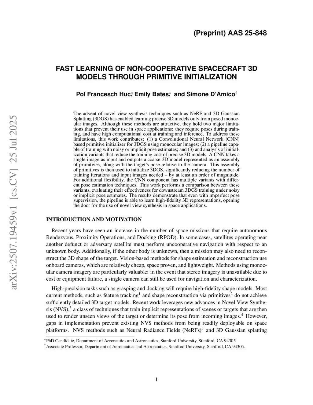 The advent of novel view synthesis techniques such as NeRF and 3D Gaussian Splatting (3DGS) has enabled learning precise 3D models only from posed monocular images. Although these methods are attractive, they hold two major limitations that prevent their use in space applications: they require poses during training, and have high computational cost at training and inference. To address these limitations, this work contributes: (1) a Convolutional Neural Network (CNN) based primitive initializer for 3DGS using monocular images; (2) a pipeline capable of training with noisy or implicit pose estimates; and (3) and analysis of initialization variants that reduce the training cost of precise 3D models. A CNN takes a single image as input and outputs a coarse 3D model represented as an assembly of primitives, along with the target's pose relative to the camera. This assembly of primitives is then used to initialize 3DGS, significantly reducing the number of training iterations and input images needed -- by at least an order of magnitude. For additional flexibility, the CNN component has multiple variants with different pose estimation techniques. This work performs a comparison between these variants, evaluating their effectiveness for downstream 3DGS training under noisy or implicit pose estimates. The results demonstrate that even with imperfect pose supervision, the pipeline is able to learn high-fidelity 3D representations, opening the door for the use of novel view synthesis in space applications.