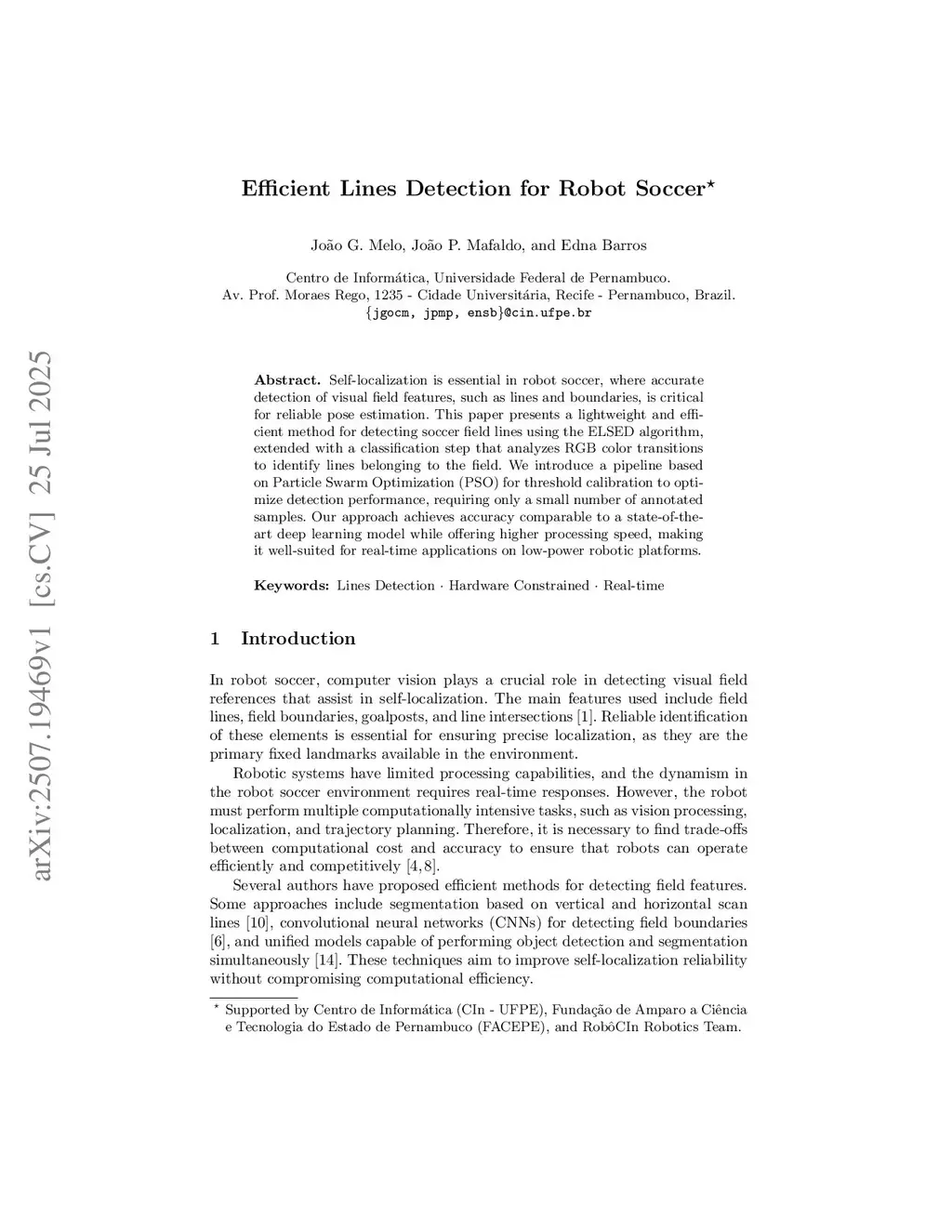 Self-localization is essential in robot soccer, where accurate detection of visual field features, such as lines and boundaries, is critical for reliable pose estimation. This paper presents a lightweight and efficient method for detecting soccer field lines using the ELSED algorithm, extended with a classification step that analyzes RGB color transitions to identify lines belonging to the field. We introduce a pipeline based on Particle Swarm Optimization (PSO) for threshold calibration to optimize detection performance, requiring only a small number of annotated samples. Our approach achieves accuracy comparable to a state-of-the-art deep learning model while offering higher processing speed, making it well-suited for real-time applications on low-power robotic platforms.