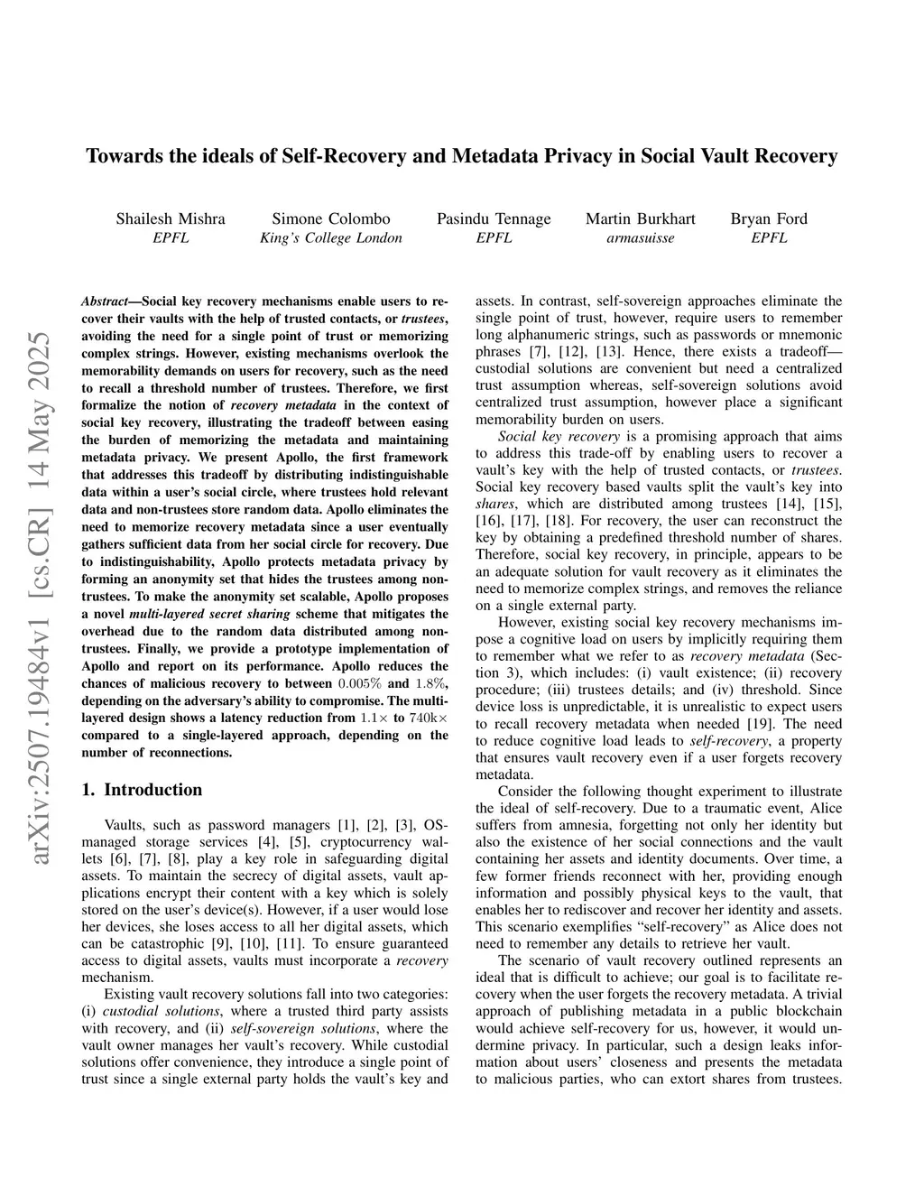 Social key recovery mechanisms enable users to recover their vaults with the help of trusted contacts, or trustees, avoiding the need for a single point of trust or memorizing complex strings. However, existing mechanisms overlook the memorability demands on users for recovery, such as the need to recall a threshold number of trustees. Therefore, we first formalize the notion of recovery metadata in the context of social key recovery, illustrating the tradeoff between easing the burden of memorizing the metadata and maintaining metadata privacy. We present Apollo, the first framework that addresses this tradeoff by distributing indistinguishable data within a user's social circle, where trustees hold relevant data and non-trustees store random data. Apollo eliminates the need to memorize recovery metadata since a user eventually gathers sufficient data from her social circle for recovery. Due to indistinguishability, Apollo protects metadata privacy by forming an anonymity set that hides the trustees among non-trustees. To make the anonymity set scalable, Apollo proposes a novel multi-layered secret sharing scheme that mitigates the overhead due to the random data distributed among non-trustees. Finally, we provide a prototype implementation of Apollo and report on its performance. Apollo reduces the chances of malicious recovery to between 0.005% and 1.8%, depending on the adversary's ability to compromise. The multi-layered design shows a latency reduction from 1.1x to 740kx compared to a single-layered approach, depending on the number of reconnections.