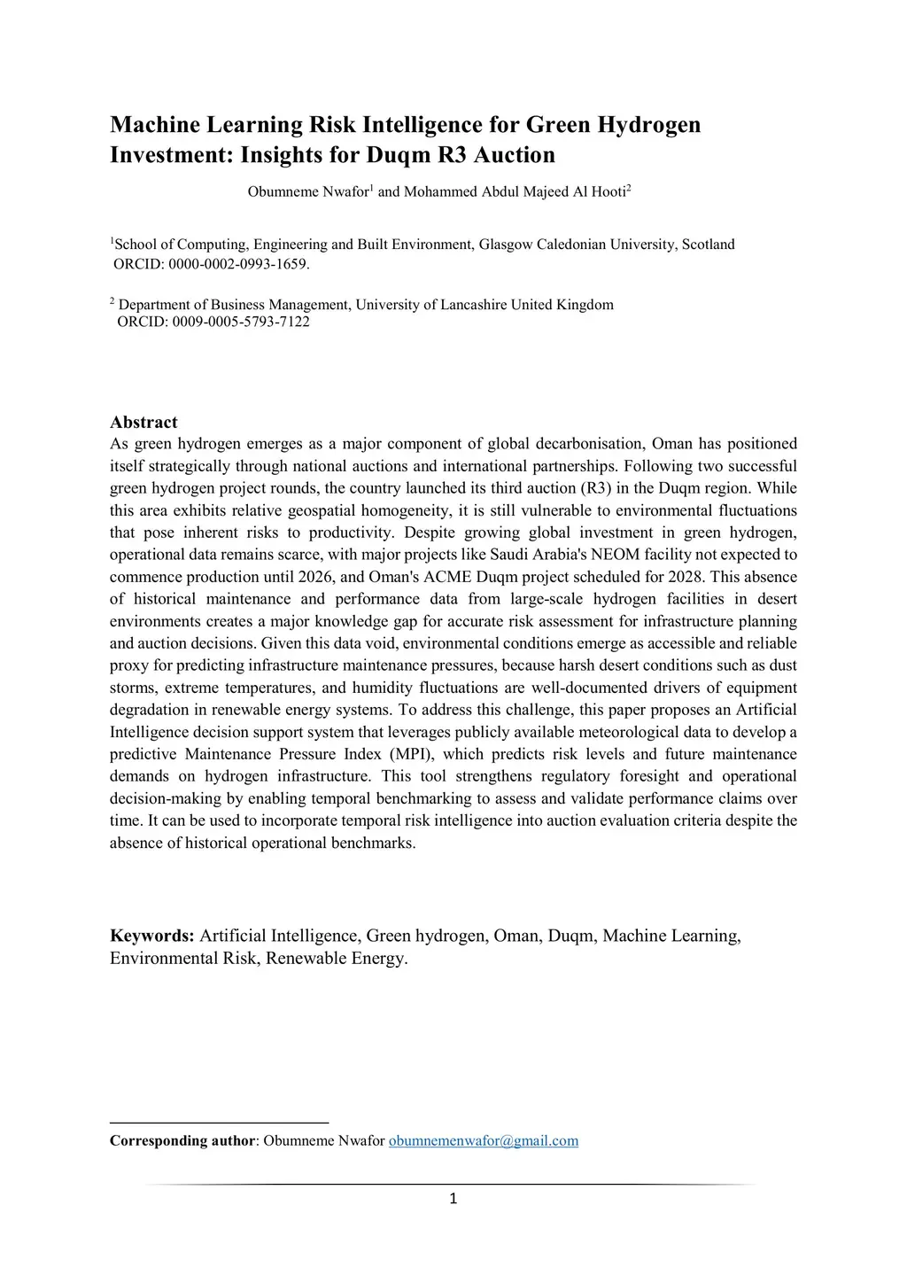 As green hydrogen emerges as a major component of global decarbonisation, Oman has positioned itself strategically through national auctions and international partnerships. Following two successful green hydrogen project rounds, the country launched its third auction (R3) in the Duqm region. While this area exhibits relative geospatial homogeneity, it is still vulnerable to environmental fluctuations that pose inherent risks to productivity. Despite growing global investment in green hydrogen, operational data remains scarce, with major projects like Saudi Arabia's NEOM facility not expected to commence production until 2026, and Oman's ACME Duqm project scheduled for 2028. This absence of historical maintenance and performance data from large-scale hydrogen facilities in desert environments creates a major knowledge gap for accurate risk assessment for infrastructure planning and auction decisions. Given this data void, environmental conditions emerge as accessible and reliable proxy for predicting infrastructure maintenance pressures, because harsh desert conditions such as dust storms, extreme temperatures, and humidity fluctuations are well-documented drivers of equipment degradation in renewable energy systems. To address this challenge, this paper proposes an Artificial Intelligence decision support system that leverages publicly available meteorological data to develop a predictive Maintenance Pressure Index (MPI), which predicts risk levels and future maintenance demands on hydrogen infrastructure. This tool strengthens regulatory foresight and operational decision-making by enabling temporal benchmarking to assess and validate performance claims over time. It can be used to incorporate temporal risk intelligence into auction evaluation criteria despite the absence of historical operational benchmarks.