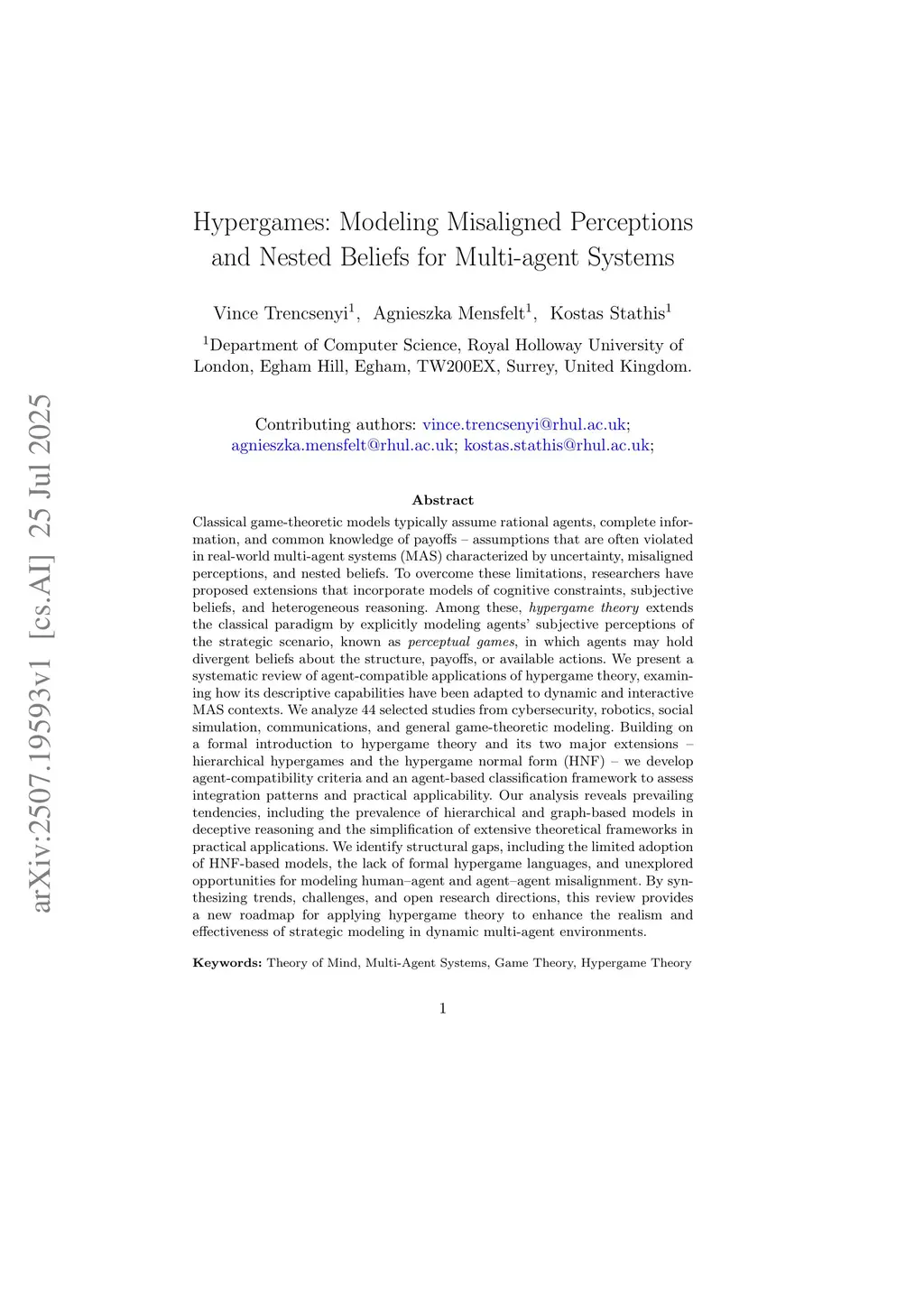 A Survey on Hypergame Theory: Modeling Misaligned Perceptions and Nested Beliefs for Multi-agent Systems