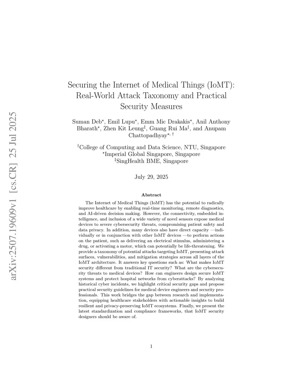 The Internet of Medical Things (IoMT) has the potential to radically improve healthcare by enabling real-time monitoring, remote diagnostics, and AI-driven decision making. However, the connectivity, embedded intelligence, and inclusion of a wide variety of novel sensors expose medical devices to severe cybersecurity threats, compromising patient safety and data privacy. In addition, many devices also have direct capacity - individually or in conjunction with other IoMT devices - to perform actions on the patient, such as delivering an electrical stimulus, administering a drug, or activating a motor, which can potentially be life-threatening. We provide a taxonomy of potential attacks targeting IoMT, presenting attack surfaces, vulnerabilities, and mitigation strategies across all layers of the IoMT architecture. It answers key questions such as: What makes IoMT security different from traditional IT security? What are the cybersecurity threats to medical devices? How can engineers design secure IoMT systems and protect hospital networks from cyberattacks? By analyzing historical cyber incidents, we highlight critical security gaps and propose practical security guidelines for medical device engineers and security professionals. This work bridges the gap between research and implementation, equipping healthcare stakeholders with actionable insights to build resilient and privacy-preserving IoMT ecosystems. Finally, we present the latest standardization and compliance frameworks, that IoMT security designers should be aware of.