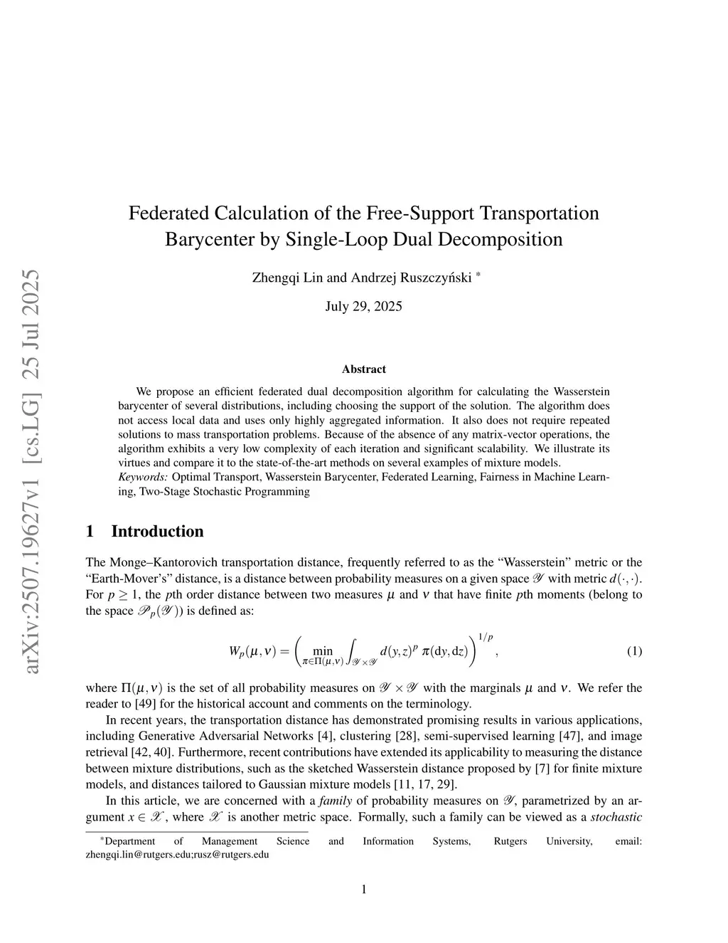 Federated Calculation of the Free-Support Transportation Barycenter by Single-Loop Dual Decomposition