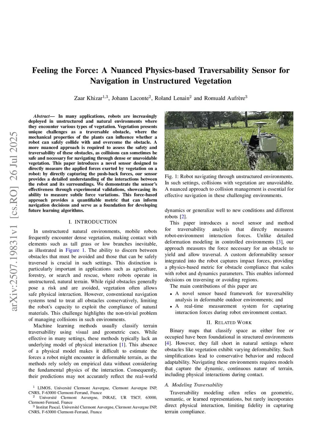 In many applications, robots are increasingly deployed in unstructured and natural environments where they encounter various types of vegetation. Vegetation presents unique challenges as a traversable obstacle, where the mechanical properties of the plants can influence whether a robot can safely collide with and overcome the obstacle. A more nuanced approach is required to assess the safety and traversability of these obstacles, as collisions can sometimes be safe and necessary for navigating through dense or unavoidable vegetation. This paper introduces a novel sensor designed to directly measure the applied forces exerted by vegetation on a robot: by directly capturing the push-back forces, our sensor provides a detailed understanding of the interactions between the robot and its surroundings. We demonstrate the sensor's effectiveness through experimental validations, showcasing its ability to measure subtle force variations. This force-based approach provides a quantifiable metric that can inform navigation decisions and serve as a foundation for developing future learning algorithms.