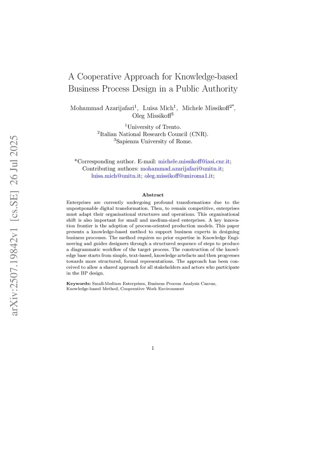 Enterprises are currently undergoing profound transformations due to the unpostponable digital transformation. Then, to remain competitive, enterprises must adapt digital solutions, transforming their organisational structures and operations. This organisational shift is also important for small and medium-sized enterprises. A key innovation frontier is the adoption of process-oriented production models. This paper presents a knowledge-based method to support business experts in designing business processes. The method requires no prior expertise in Knowledge Engineering and guides designers through a structured sequence of steps to produce a diagrammatic workflow of the target process. The construction of the knowledge base starts from simple, text-based, knowledge artefacts and then progresses towards more structured, formal representations. The approach has been conceived to allow a shared approach for all stakeholders and actors who participate in the BP design.