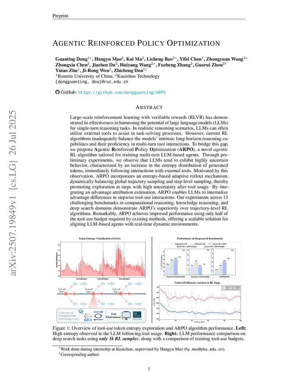Large-scale reinforcement learning with verifiable rewards (RLVR) has demonstrated its effectiveness in harnessing the potential of large language models (LLMs) for single-turn reasoning tasks. In realistic reasoning scenarios, LLMs can often utilize external tools to assist in task-solving processes. However, current RL algorithms inadequately balance the models' intrinsic long-horizon reasoning capabilities and their proficiency in multi-turn tool interactions. To bridge this gap, we propose Agentic Reinforced Policy Optimization (ARPO), a novel agentic RL algorithm tailored for training multi-turn LLM-based agents. Through preliminary experiments, we observe that LLMs tend to exhibit highly uncertain behavior, characterized by an increase in the entropy distribution of generated tokens, immediately following interactions with external tools. Motivated by this observation, ARPO incorporates an entropy-based adaptive rollout mechanism, dynamically balancing global trajectory sampling and step-level sampling, thereby promoting exploration at steps with high uncertainty after tool usage. By integrating an advantage attribution estimation, ARPO enables LLMs to internalize advantage differences in stepwise tool-use interactions. Our experiments across 13 challenging benchmarks in computational reasoning, knowledge reasoning, and deep search domains demonstrate ARPO's superiority over trajectory-level RL algorithms. Remarkably, ARPO achieves improved performance using only half of the tool-use budget required by existing methods, offering a scalable solution for aligning LLM-based agents with real-time dynamic environments. Our code and datasets are released atthis https URL