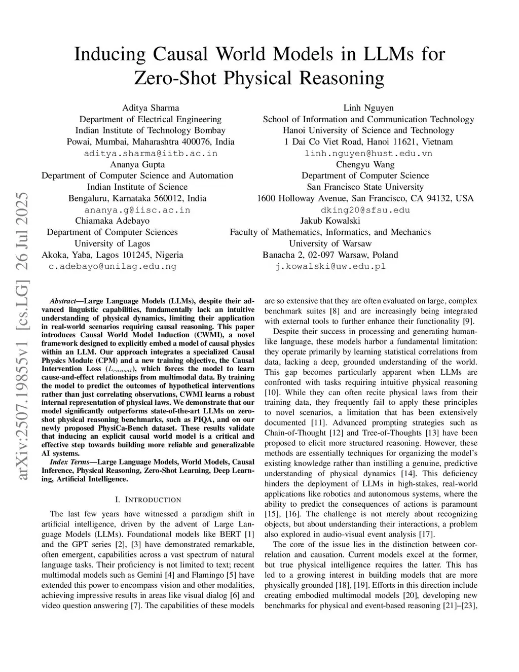 Large Language Models (LLMs), despite their advanced linguistic capabilities, fundamentally lack an intuitive understanding of physical dynamics, which limits their effectiveness in real-world scenarios that require causal reasoning. In this paper, we introduce Causal World Model Induction (CWMI), a novel framework designed to embed an explicit model of causal physics within an LLM. Our approach incorporates a dedicated Causal Physics Module (CPM) and a new training objective called Causal Intervention Loss, encouraging the model to learn cause-and-effect relationships from multimodal data. By training the model to predict the outcomes of hypothetical interventions instead of merely capturing statistical correlations, CWMI develops a robust internal representation of physical laws. Experimental results show that CWMI significantly outperforms state-of-the-art LLMs on zero-shot physical reasoning tasks, including the PIQA benchmark and our newly proposed PhysiCa-Bench dataset. These findings demonstrate that inducing a causal world model is a critical step toward more reliable and generalizable AI systems.