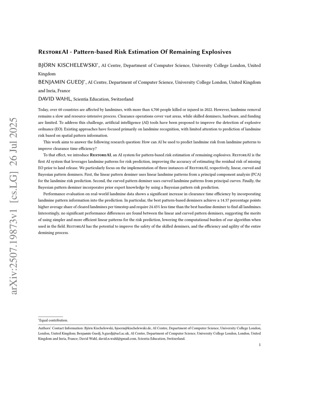 Landmine removal is a slow, resource-intensive process affecting over 60 countries. While AI has been proposed to enhance explosive ordnance (EO) detection, existing methods primarily focus on object recognition, with limited attention to prediction of landmine risk based on spatial pattern information. This work aims to answer the following research question: How can AI be used to predict landmine risk from landmine patterns to improve clearance time efficiency? To that effect, we introduce RestoreAI, an AI system for pattern-based risk estimation of remaining explosives. RestoreAI is the first AI system that leverages landmine patterns for risk prediction, improving the accuracy of estimating the residual risk of missing EO prior to land release. We particularly focus on the implementation of three instances of RestoreAI, respectively, linear, curved and Bayesian pattern deminers. First, the linear pattern deminer uses linear landmine patterns from a principal component analysis (PCA) for the landmine risk prediction. Second, the curved pattern deminer uses curved landmine patterns from principal curves. Finally, the Bayesian pattern deminer incorporates prior expert knowledge by using a Bayesian pattern risk prediction. Evaluated on real-world landmine data, RestoreAI significantly boosts clearance efficiency. The top-performing pattern-based deminers achieved a 14.37 percentage point increase in the average share of cleared landmines per timestep and required 24.45% less time than the best baseline deminer to locate all landmines. Interestingly, linear and curved pattern deminers showed no significant performance difference, suggesting that more efficient linear patterns are a viable option for risk prediction.