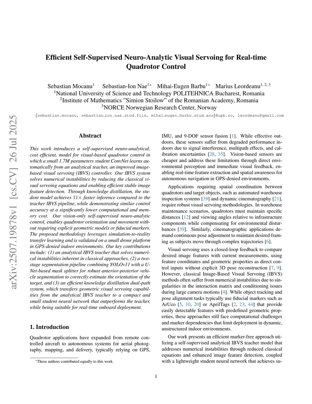 This work introduces a self-supervised neuro-analytical, cost efficient, model for visual-based quadrotor control in which a small 1.7M parameters student ConvNet learns automatically from an analytical teacher, an improved image-based visual servoing (IBVS) controller. Our IBVS system solves numerical instabilities by reducing the classical visual servoing equations and enabling efficient stable image feature detection. Through knowledge distillation, the student model achieves 11x faster inference compared to the teacher IBVS pipeline, while demonstrating similar control accuracy at a significantly lower computational and memory cost. Our vision-only self-supervised neuro-analytic control, enables quadrotor orientation and movement without requiring explicit geometric models or fiducial markers. The proposed methodology leverages simulation-to-reality transfer learning and is validated on a small drone platform in GPS-denied indoor environments. Our key contributions include: (1) an analytical IBVS teacher that solves numerical instabilities inherent in classical approaches, (2) a two-stage segmentation pipeline combining YOLOv11 with a U-Net-based mask splitter for robust anterior-posterior vehicle segmentation to correctly estimate the orientation of the target, and (3) an efficient knowledge distillation dual-path system, which transfers geometric visual servoing capabilities from the analytical IBVS teacher to a compact and small student neural network that outperforms the teacher, while being suitable for real-time onboard deployment.