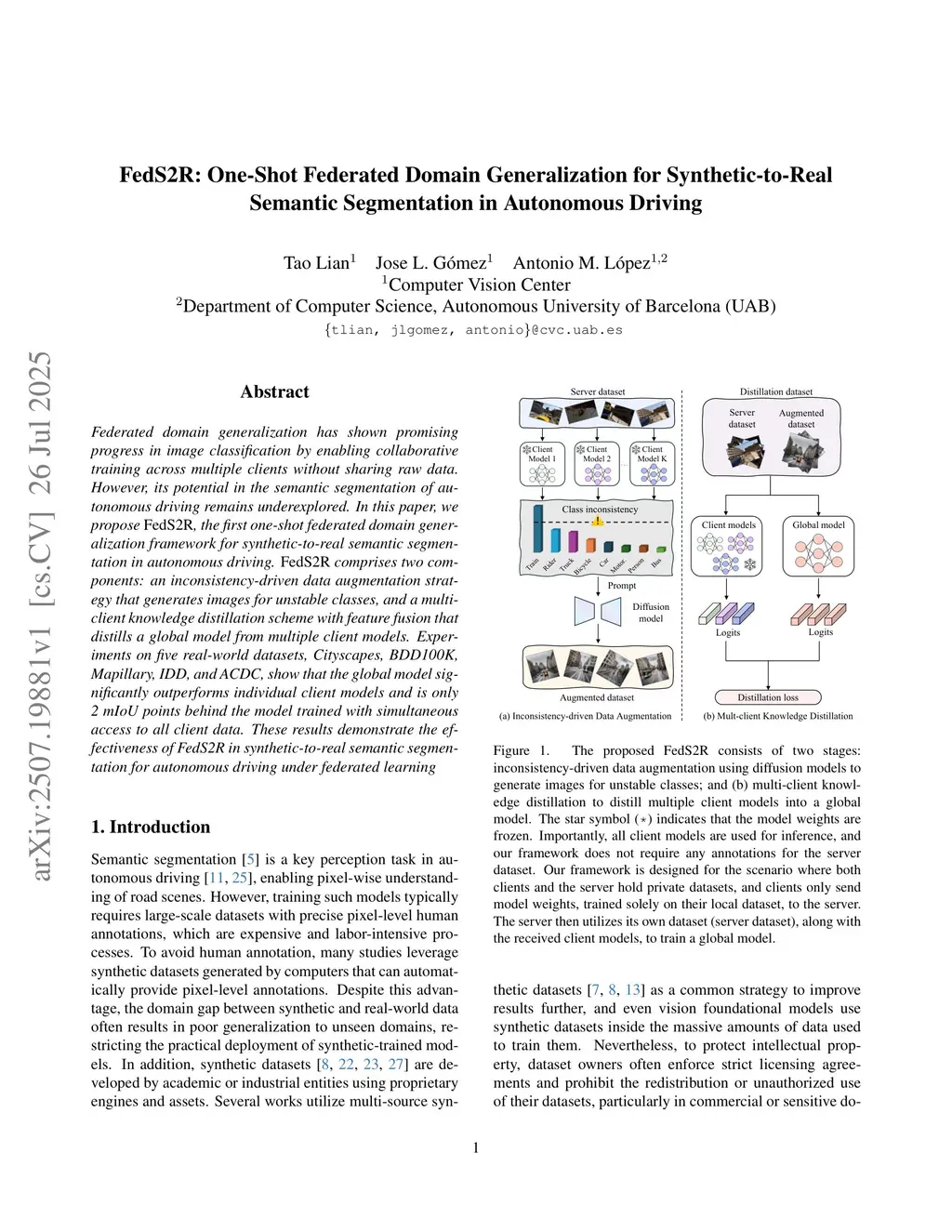 Federated domain generalization has shown promising progress in image classification by enabling collaborative training across multiple clients without sharing raw data. However, its potential in the semantic segmentation of autonomous driving remains underexplored. In this paper, we propose FedS2R, the first one-shot federated domain generalization framework for synthetic-to-real semantic segmentation in autonomous driving. FedS2R comprises two components: an inconsistency-driven data augmentation strategy that generates images for unstable classes, and a multi-client knowledge distillation scheme with feature fusion that distills a global model from multiple client models. Experiments on five real-world datasets, Cityscapes, BDD100K, Mapillary, IDD, and ACDC, show that the global model significantly outperforms individual client models and is only 2 mIoU points behind the model trained with simultaneous access to all client data. These results demonstrate the effectiveness of FedS2R in synthetic-to-real semantic segmentation for autonomous driving under federated learning