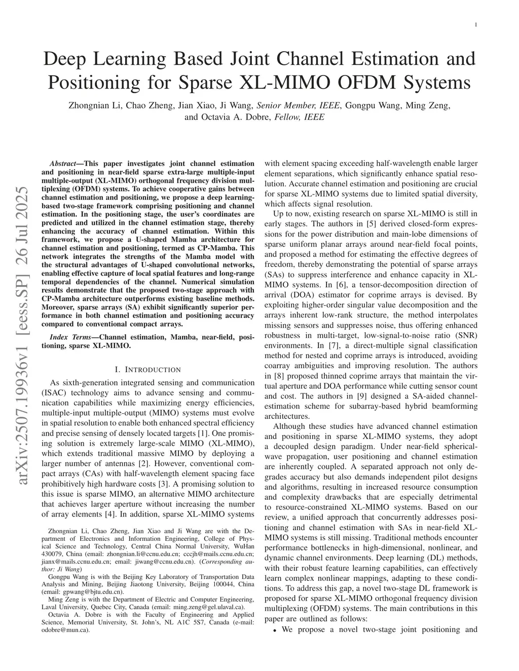 This paper investigates joint channel estimation and positioning in near-field sparse extra-large multiple-input multiple-output (XL-MIMO) orthogonal frequency division multiplexing (OFDM) systems. To achieve cooperative gains between channel estimation and positioning, we propose a deep learning-based two-stage framework comprising positioning and channel estimation. In the positioning stage, the user's coordinates are predicted and utilized in the channel estimation stage, thereby enhancing the accuracy of channel estimation. Within this framework, we propose a U-shaped Mamba architecture for channel estimation and positioning, termed as CP-Mamba. This network integrates the strengths of the Mamba model with the structural advantages of U-shaped convolutional networks, enabling effective capture of local spatial features and long-range temporal dependencies of the channel. Numerical simulation results demonstrate that the proposed two-stage approach with CP-Mamba architecture outperforms existing baseline methods. Moreover, sparse arrays (SA) exhibit significantly superior performance in both channel estimation and positioning accuracy compared to conventional compact arrays.
