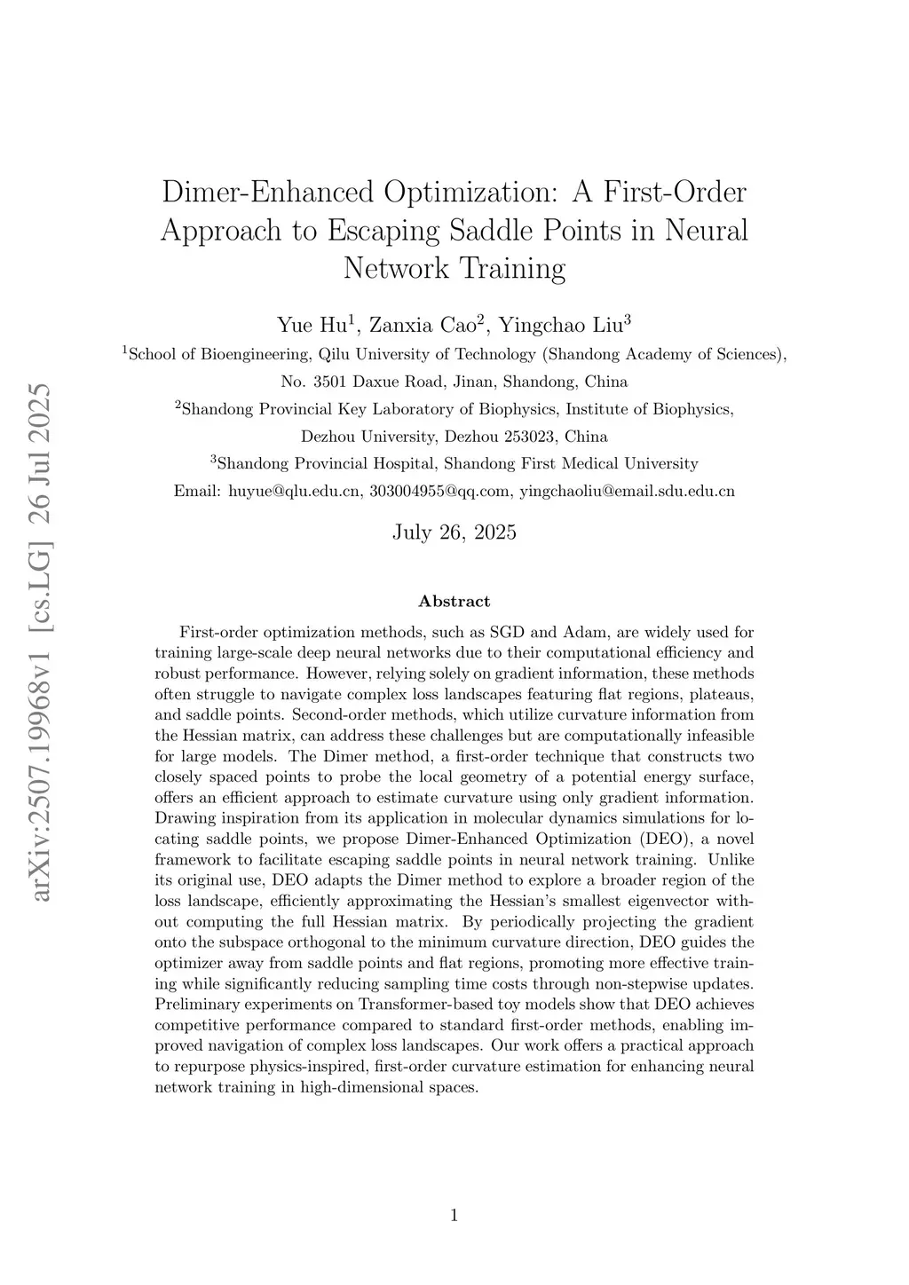 First-order optimization methods, such as SGD and Adam, are widely used for training large-scale deep neural networks due to their computational efficiency and robust performance. However, relying solely on gradient information, these methods often struggle to navigate complex loss landscapes with flat regions, plateaus, and saddle points. Second-order methods, which use curvature information from the Hessian matrix, can address these challenges but are computationally infeasible for large models. The Dimer method, a first-order technique that constructs two closely spaced points to probe the local geometry of a potential energy surface, efficiently estimates curvature using only gradient information. Inspired by its use in molecular dynamics simulations for locating saddle points, we propose Dimer-Enhanced Optimization (DEO), a novel framework to escape saddle points in neural network training. DEO adapts the Dimer method to explore a broader region of the loss landscape, approximating the Hessian's smallest eigenvector without computing the full matrix. By periodically projecting the gradient onto the subspace orthogonal to the minimum curvature direction, DEO guides the optimizer away from saddle points and flat regions, enhancing training efficiency with non-stepwise updates. Preliminary experiments on a Transformer toy model show DEO achieves competitive performance compared to standard first-order methods, improving navigation of complex loss landscapes. Our work repurposes physics-inspired, first-order curvature estimation to enhance neural network training in high-dimensional spaces.