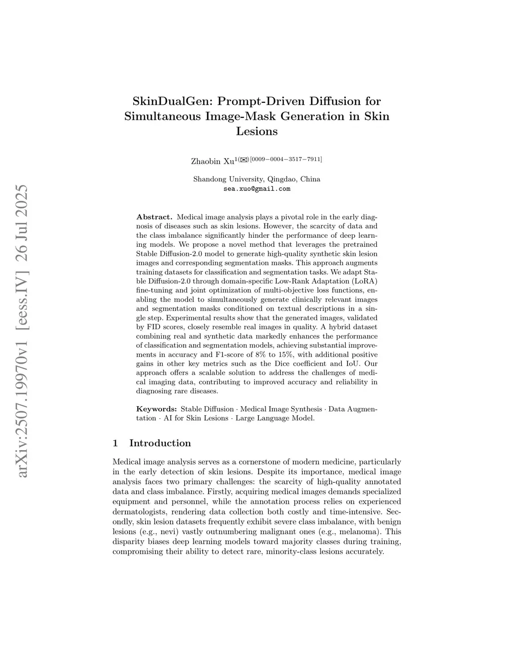 Medical image analysis plays a pivotal role in the early diagnosis of diseases such as skin lesions. However, the scarcity of data and the class imbalance significantly hinder the performance of deep learning models. We propose a novel method that leverages the pretrained Stable Diffusion-2.0 model to generate high-quality synthetic skin lesion images and corresponding segmentation masks. This approach augments training datasets for classification and segmentation tasks. We adapt Stable Diffusion-2.0 through domain-specific Low-Rank Adaptation (LoRA) fine-tuning and joint optimization of multi-objective loss functions, enabling the model to simultaneously generate clinically relevant images and segmentation masks conditioned on textual descriptions in a single step. Experimental results show that the generated images, validated by FID scores, closely resemble real images in quality. A hybrid dataset combining real and synthetic data markedly enhances the performance of classification and segmentation models, achieving substantial improvements in accuracy and F1-score of 8% to 15%, with additional positive gains in other key metrics such as the Dice coefficient and IoU. Our approach offers a scalable solution to address the challenges of medical imaging data, contributing to improved accuracy and reliability in diagnosing rare diseases.