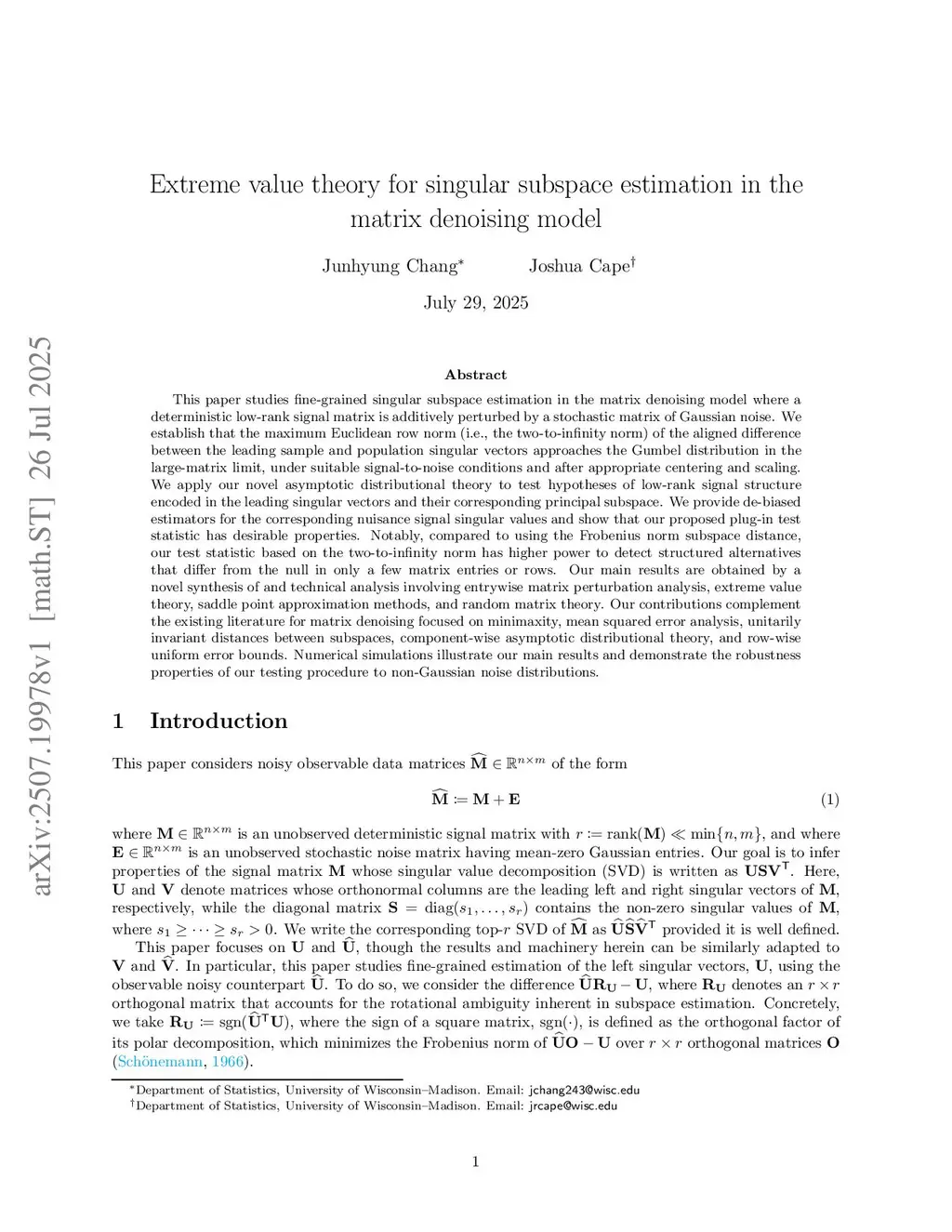This paper studies fine-grained singular subspace estimation in the matrix denoising model where a deterministic low-rank signal matrix is additively perturbed by a stochastic matrix of Gaussian noise. We establish that the maximum Euclidean row norm (i.e., the two-to-infinity norm) of the aligned difference between the leading sample and population singular vectors approaches the Gumbel distribution in the large-matrix limit, under suitable signal-to-noise conditions and after appropriate centering and scaling. We apply our novel asymptotic distributional theory to test hypotheses of low-rank signal structure encoded in the leading singular vectors and their corresponding principal subspace. We provide de-biased estimators for the corresponding nuisance signal singular values and show that our proposed plug-in test statistic has desirable properties. Notably, compared to using the Frobenius norm subspace distance, our test statistic based on the two-to-infinity norm empirically has higher power to detect structured alternatives that differ from the null in only a few matrix entries or rows. Our main results are obtained by a novel synthesis of and technical analysis involving row-wise matrix perturbation analysis, extreme value theory, saddle point approximation methods, and random matrix theory. Our contributions complement the existing literature for matrix denoising focused on minimaxity, mean squared error analysis, unitarily invariant distances between subspaces, component-wise asymptotic distributional theory, and row-wise uniform error bounds. Numerical simulations illustrate our main results and demonstrate the robustness properties of our testing procedure to non-Gaussian noise distributions.