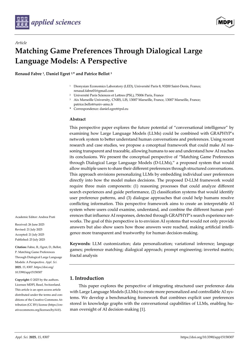 This perspective paper explores the future potential of "conversational intelligence" by examining how Large Language Models (LLMs) could be combined with GRAPHYP's network system to better understand human conversations and preferences. Using recent research and case studies, we propose a conceptual framework that could make AI rea-soning transparent and traceable, allowing humans to see and understand how AI reaches its conclusions. We present the conceptual perspective of "Matching Game Preferences through Dialogical Large Language Models (D-LLMs)," a proposed system that would allow multiple users to share their different preferences through structured conversations. This approach envisions personalizing LLMs by embedding individual user preferences directly into how the model makes decisions. The proposed D-LLM framework would require three main components: (1) reasoning processes that could analyze different search experiences and guide performance, (2) classification systems that would identify user preference patterns, and (3) dialogue approaches that could help humans resolve conflicting information. This perspective framework aims to create an interpretable AI system where users could examine, understand, and combine the different human preferences that influence AI responses, detected through GRAPHYP's search experience networks. The goal of this perspective is to envision AI systems that would not only provide answers but also show users how those answers were reached, making artificial intelligence more transparent and trustworthy for human decision-making.