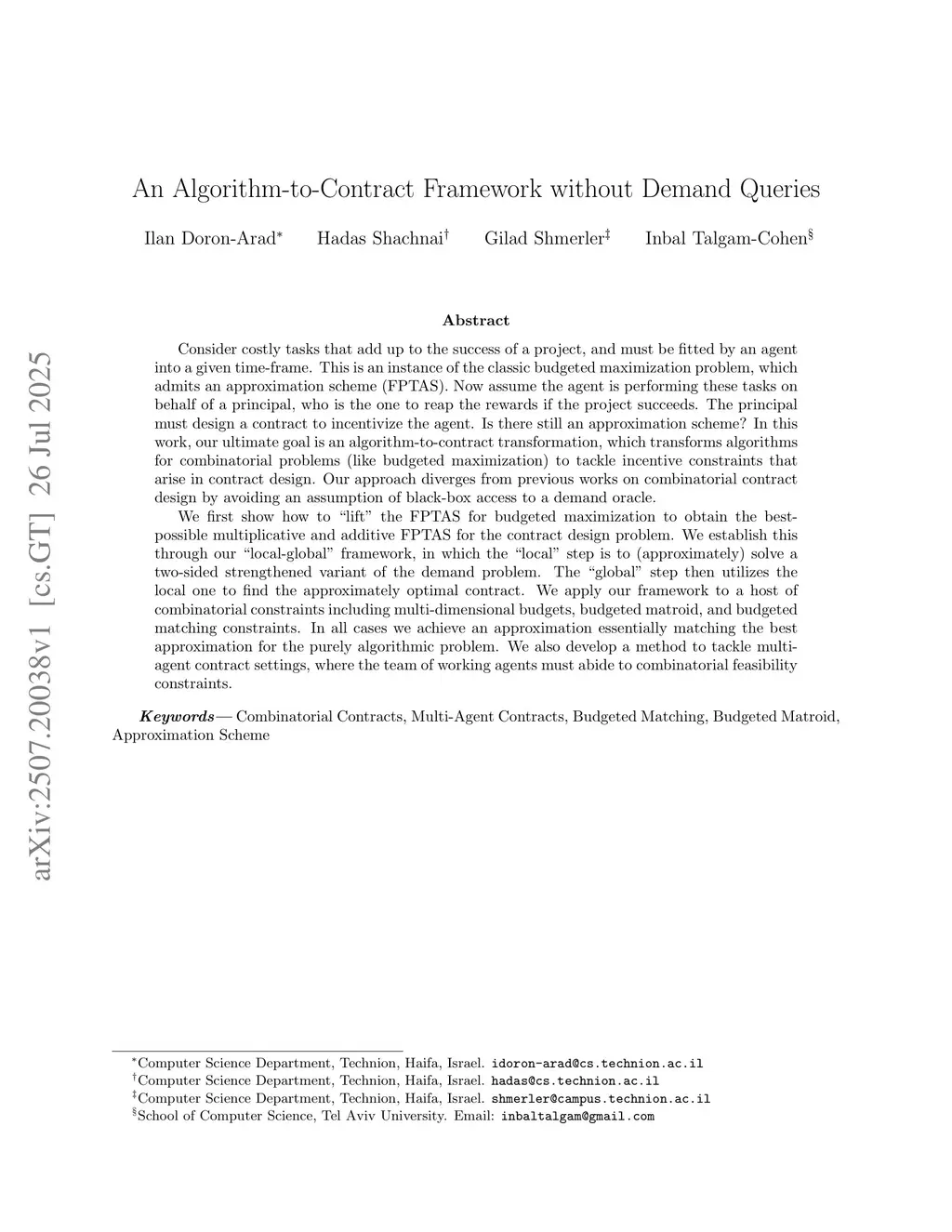 Consider costly tasks that add up to the success of a project, and must be fitted by an agent into a given time-frame. This is an instance of the classic budgeted maximization problem, which admits an approximation scheme (FPTAS). Now assume the agent is performing these tasks on behalf of a principal, who is the one to reap the rewards if the project succeeds. The principal must design a contract to incentivize the agent. Is there still an approximation scheme? In this work, our ultimate goal is an algorithm-to-contract transformation, which transforms algorithms for combinatorial problems (like budgeted maximization) to tackle incentive constraints that arise in contract design. Our approach diverges from previous works on combinatorial contract design by avoiding an assumption of black-box access to a demand oracle.We first show how to "lift" the FPTAS for budgeted maximization to obtain the best-possible multiplicative and additive FPTAS for the contract design problem. We establish this through our "local-global" framework, in which the "local" step is to (approximately) solve a two-sided strengthened variant of the demand problem. The "global" step then utilizes the local one to find the approximately optimal contract. We apply our framework to a host of combinatorial constraints including multi-dimensional budgets, budgeted matroid, and budgeted matching constraints. In all cases we achieve an approximation essentially matching the best approximation for the purely algorithmic problem. We also develop a method to tackle multi-agent contract settings, where the team of working agents must abide to combinatorial feasibility constraints.