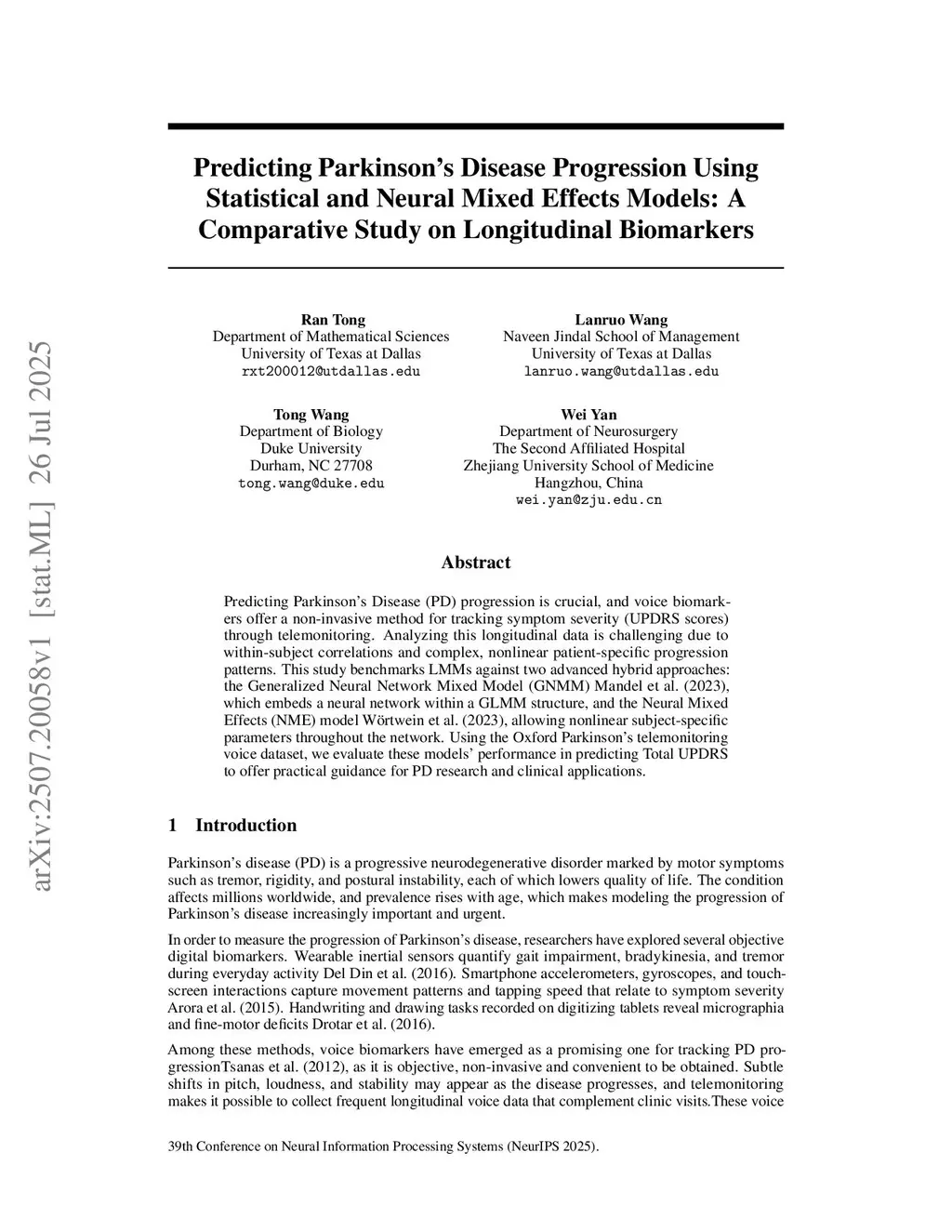 Predicting Parkinson's Disease Progression Using Statistical and Neural Mixed Effects Models: Comparative Study on Longitudinal Biomarkers