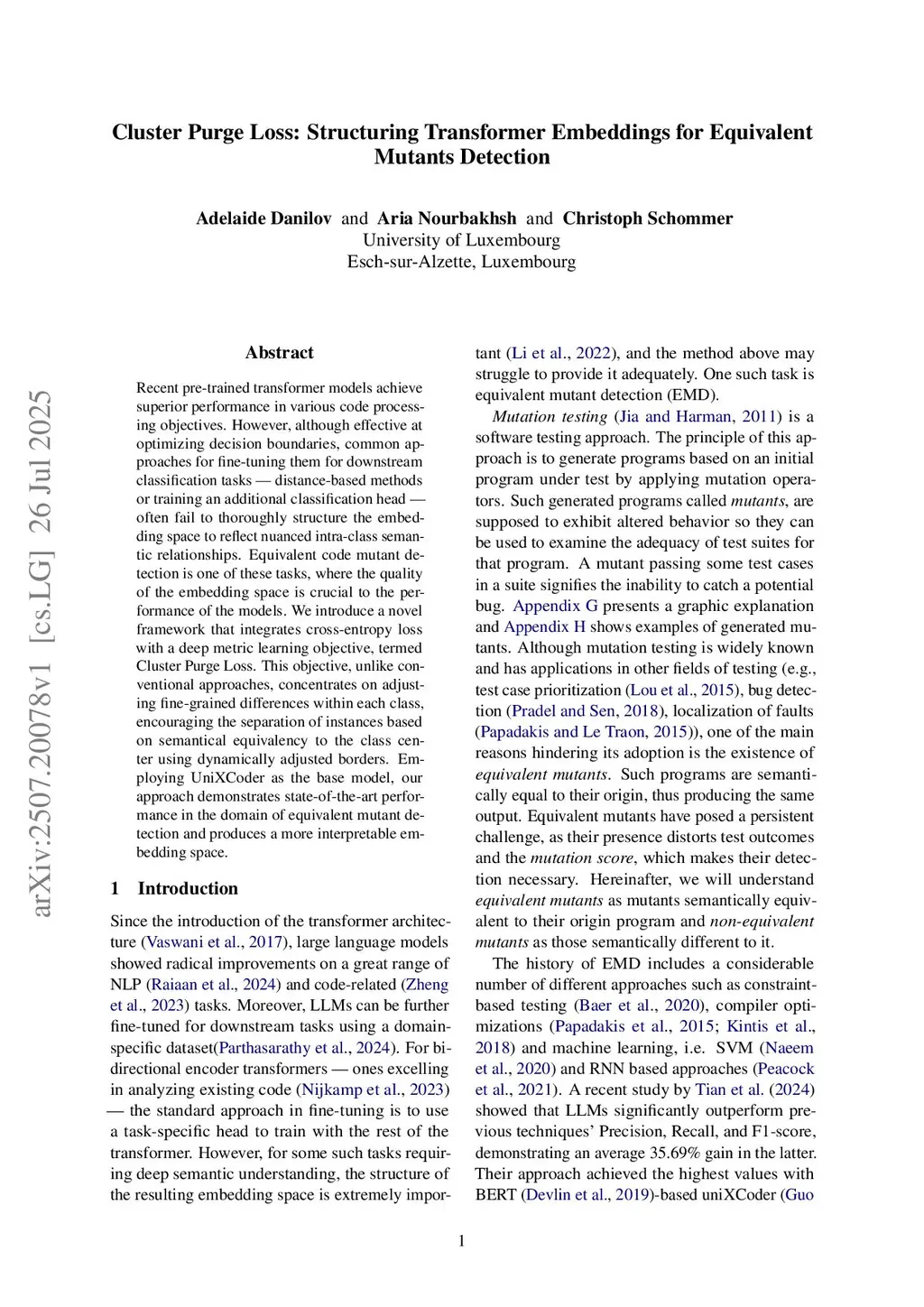 Cluster Purge Loss: Structuring Transformer Embeddings for Equivalent Mutants Detection