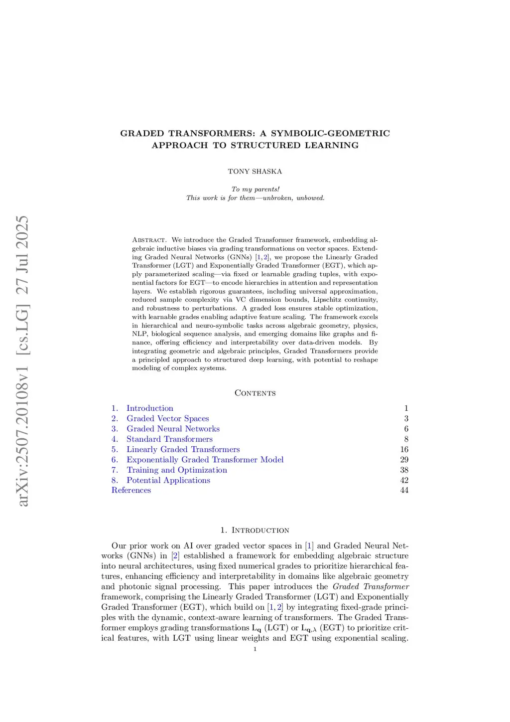 We introduce the Graded Transformer framework, a new class of sequence models that embeds algebraic inductive biases through grading transformations on vector spaces. Extending Graded Neural Networks (GNNs), we propose two architectures: the Linearly Graded Transformer (LGT) and the Exponentially Graded Transformer (EGT). These models apply parameterized scaling operators, governed by fixed or learnable grading tuples and in the case of EGT exponential factors, to encode hierarchical structure in attention and representation layers and to improve efficiency for structured data.We establish rigorous guarantees, including universal approximation theorems for continuous and Sobolev functions, reduced sample complexity via effective VC dimension bounds, Lipschitz continuity of graded operations, and robustness to perturbations. A graded loss ensures gradient stability and alignment with domain priors during optimization. By treating grades as differentiable parameters, the framework enables adaptive feature prioritization, overcoming limitations of fixed grades in earlier models.The Graded Transformer provides a mathematically principled approach to hierarchical learning and neuro-symbolic reasoning. Applications include algebraic geometry (moduli spaces and zeta functions), physics (multiscale systems), natural language processing (syntactic parsing), biological sequence analysis (variant prediction), robotics and autonomous systems (safety-critical prioritization), the automotive industry (certifiable AI for ADAS), and blockchain and financial cryptography (secure coding and structured prediction).