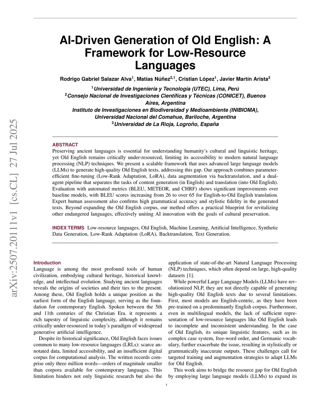 Preserving ancient languages is essential for understanding humanity's cultural and linguistic heritage, yet Old English remains critically under-resourced, limiting its accessibility to modern natural language processing (NLP) techniques. We present a scalable framework that uses advanced large language models (LLMs) to generate high-quality Old English texts, addressing this gap. Our approach combines parameter-efficient fine-tuning (Low-Rank Adaptation, LoRA), data augmentation via backtranslation, and a dual-agent pipeline that separates the tasks of content generation (in English) and translation (into Old English). Evaluation with automated metrics (BLEU, METEOR, and CHRF) shows significant improvements over baseline models, with BLEU scores increasing from 26 to over 65 for English-to-Old English translation. Expert human assessment also confirms high grammatical accuracy and stylistic fidelity in the generated texts. Beyond expanding the Old English corpus, our method offers a practical blueprint for revitalizing other endangered languages, effectively uniting AI innovation with the goals of cultural preservation.