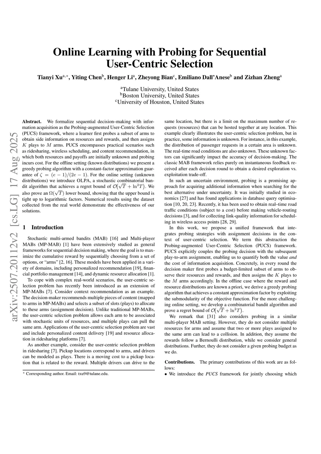 We formalize sequential decision-making with information acquisition as the probing-augmented user-centric selection (PUCS) framework, where a learner first probes a subset of arms to obtain side information on resources and rewards, and then assigns plays to arms. PUCS covers applications such as ridesharing, wireless scheduling, and content recommendation, in which both resources and payoffs are initially unknown and probing is costly. For the offline setting with known distributions, we present a greedy probing algorithm with a constant-factor approximation guarantee . For the online setting with unknown distributions, we introduce OLPA, a stochastic combinatorial bandit algorithm that achieves a regret bound . We also prove a lower bound , showing that the upper bound is tight up to logarithmic factors. Experiments on real-world data demonstrate the effectiveness of our solutions.