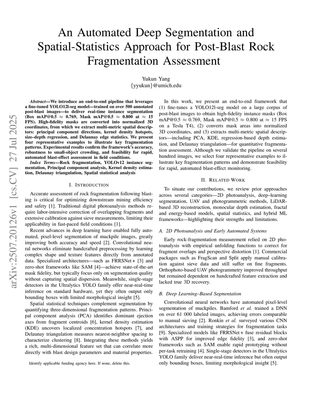 We introduce an end-to-end pipeline that leverages a fine-tuned YOLO12l-seg model -- trained on over 500 annotated post-blast images -- to deliver real-time instance segmentation (Box mAP@0.5 ~ 0.769, Mask mAP@0.5 ~ 0.800 at ~ 15 FPS). High-fidelity masks are converted into normalized 3D coordinates, from which we extract multi-metric spatial descriptors: principal component directions, kernel density hotspots, size-depth regression, and Delaunay edge statistics. We present four representative examples to illustrate key fragmentation patterns. Experimental results confirm the framework's accuracy, robustness to small-object crowding, and feasibility for rapid, automated blast-effect assessment in field conditions.