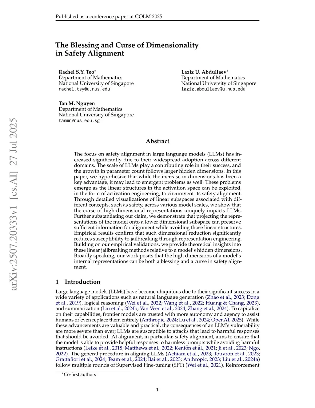The Blessing and Curse of Dimensionality in Safety Alignment