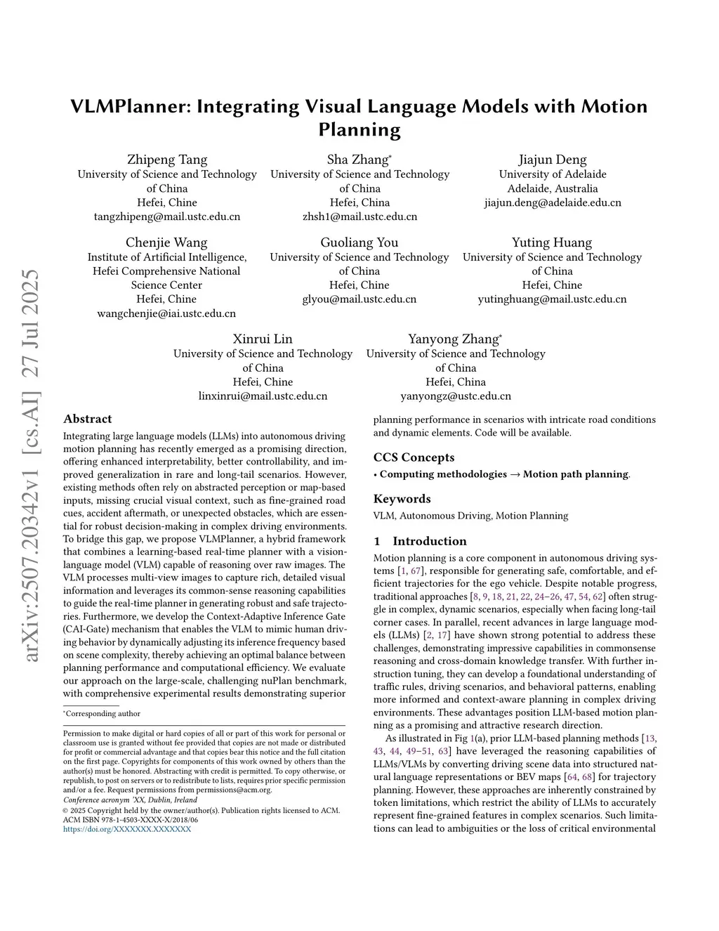 Integrating large language models (LLMs) into autonomous driving motion planning has recently emerged as a promising direction, offering enhanced interpretability, better controllability, and improved generalization in rare and long-tail scenarios. However, existing methods often rely on abstracted perception or map-based inputs, missing crucial visual context, such as fine-grained road cues, accident aftermath, or unexpected obstacles, which are essential for robust decision-making in complex driving environments. To bridge this gap, we propose VLMPlanner, a hybrid framework that combines a learning-based real-time planner with a vision-language model (VLM) capable of reasoning over raw images. The VLM processes multi-view images to capture rich, detailed visual information and leverages its common-sense reasoning capabilities to guide the real-time planner in generating robust and safe trajectories. Furthermore, we develop the Context-Adaptive Inference Gate (CAI-Gate) mechanism that enables the VLM to mimic human driving behavior by dynamically adjusting its inference frequency based on scene complexity, thereby achieving an optimal balance between planning performance and computational efficiency. We evaluate our approach on the large-scale, challenging nuPlan benchmark, with comprehensive experimental results demonstrating superior planning performance in scenarios with intricate road conditions and dynamic elements. Code will be available.