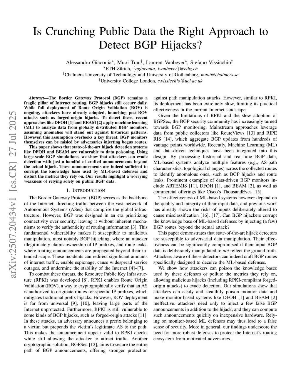 The Border Gateway Protocol (BGP) remains a fragile pillar of Internet routing. BGP hijacks still occurr daily. While full deployment of Route Origin Validation (ROV) is ongoing, attackers have already adapted, launching post-ROV attacks such as forged-origin hijacks. To detect these, recent approaches like DFOH [Holterbach et al., USENIX NSDI '24] and BEAM [Chen et al., USENIX Security '24] apply machine learning (ML) to analyze data from globally distributed BGP monitors, assuming anomalies will stand out against historical patterns. However, this assumption overlooks a key threat: BGP monitors themselves can be misled by adversaries injecting bogus routes. This paper shows that state-of-the-art hijack detection systems like DFOH and BEAM are vulnerable to data poisoning. Using large-scale BGP simulations, we show that attackers can evade detection with just a handful of crafted announcements beyond the actual hijack. These announcements are indeed sufficient to corrupt the knowledge base used by ML-based defenses and distort the metrics they rely on. Our results highlight a worrying weakness of relying solely on public BGP data.