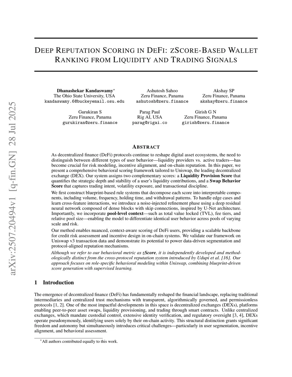 As decentralized finance (DeFi) evolves, distinguishing between user behaviors - liquidity provision versus active trading - has become vital for risk modeling and on-chain reputation. We propose a behavioral scoring framework for Uniswap that assigns two complementary scores: a Liquidity Provision Score that assesses strategic liquidity contributions, and a Swap Behavior Score that reflects trading intent, volatility exposure, and discipline. The scores are constructed using rule-based blueprints that decompose behavior into volume, frequency, holding time, and withdrawal patterns. To handle edge cases and learn feature interactions, we introduce a deep residual neural network with densely connected skip blocks inspired by the U-Net architecture. We also incorporate pool-level context such as total value locked (TVL), fee tiers, and pool size, allowing the system to differentiate similar user behaviors across pools with varying characteristics. Our framework enables context-aware and scalable DeFi user scoring, supporting improved risk assessment and incentive design. Experiments on Uniswap v3 data show its usefulness for user segmentation and protocol-aligned reputation systems. Although we refer to our metric as zScore, it is independently developed and methodologically different from the cross-protocol system proposed by Udupi et al. Our focus is on role-specific behavioral modeling within Uniswap using blueprint logic and supervised learning.
